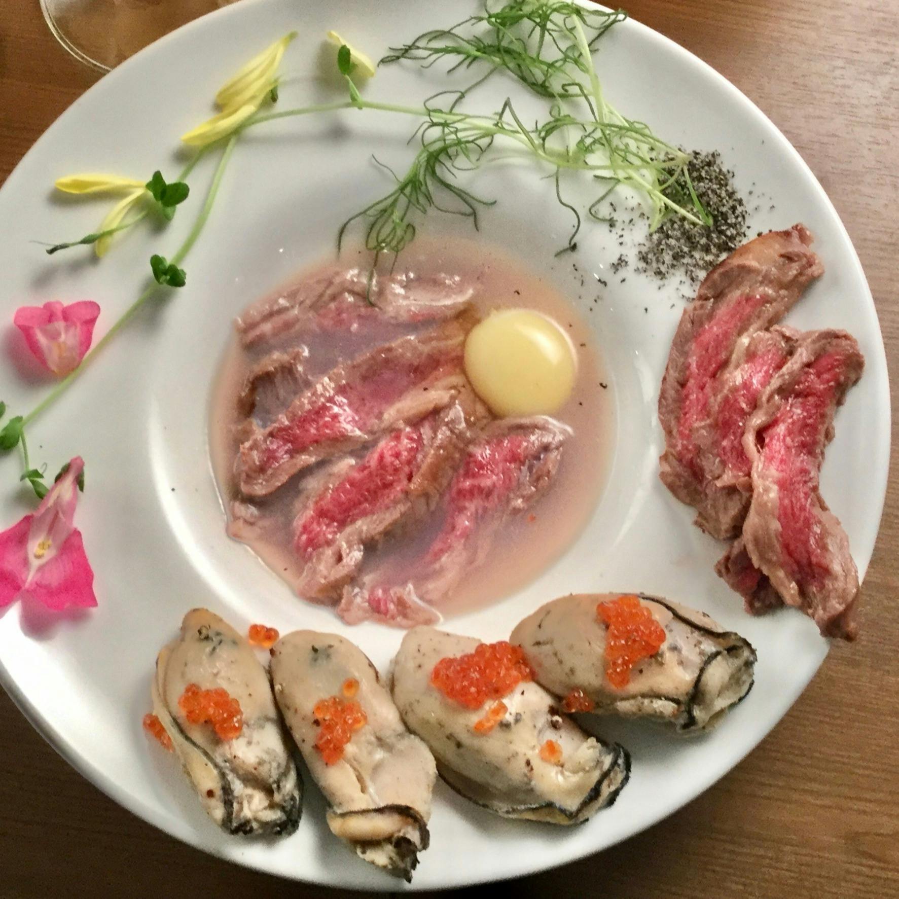 モルタルの壁にアンティーク家具、ドライフラワーなどで演出された空間は、まるで映画のワンシーン。そんな幻想的な雰囲気の中、贅沢食材を使った創作フレンチの数々を味わえる【la princesse kyoto】。中でも、広島産の大粒牡蠣を使った「牡蠣のジョン」や、牡蠣をA5和牛とともに食す「牡蠣と和牛のすき焼き」、雲丹と和牛の「うにく」は、当店自慢の逸品。クラフトビールや京都の日本酒、ワインとのペリングも愉しめます。昼飲みや1人飲みにもぜひご利用ください。