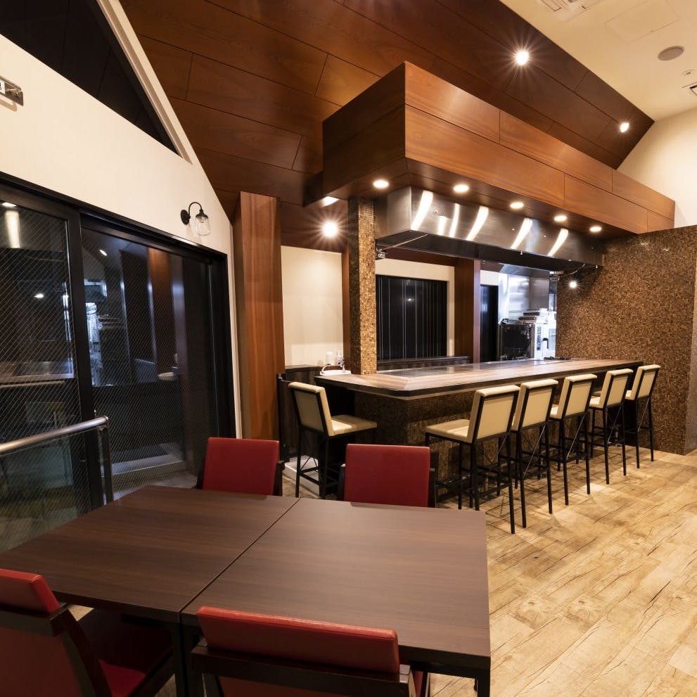 鉄板焼店のために設計された黒い外観がスタイリッシュな一軒家。1階は個室、2階はカウンター席とテーブル席をご用意しています。黒を基調としたインテリアはモダンでシックな雰囲気。2階は高い天井と大きな窓が相まって、開放的な空間を演出しています。カウンター席ではシェフの手さばきをライブ感たっぷりにお楽しみいただけます。個室は4名様~8名様まで利用可。貸切も可能なので、各種パーティにぜひ、ご利用ください。