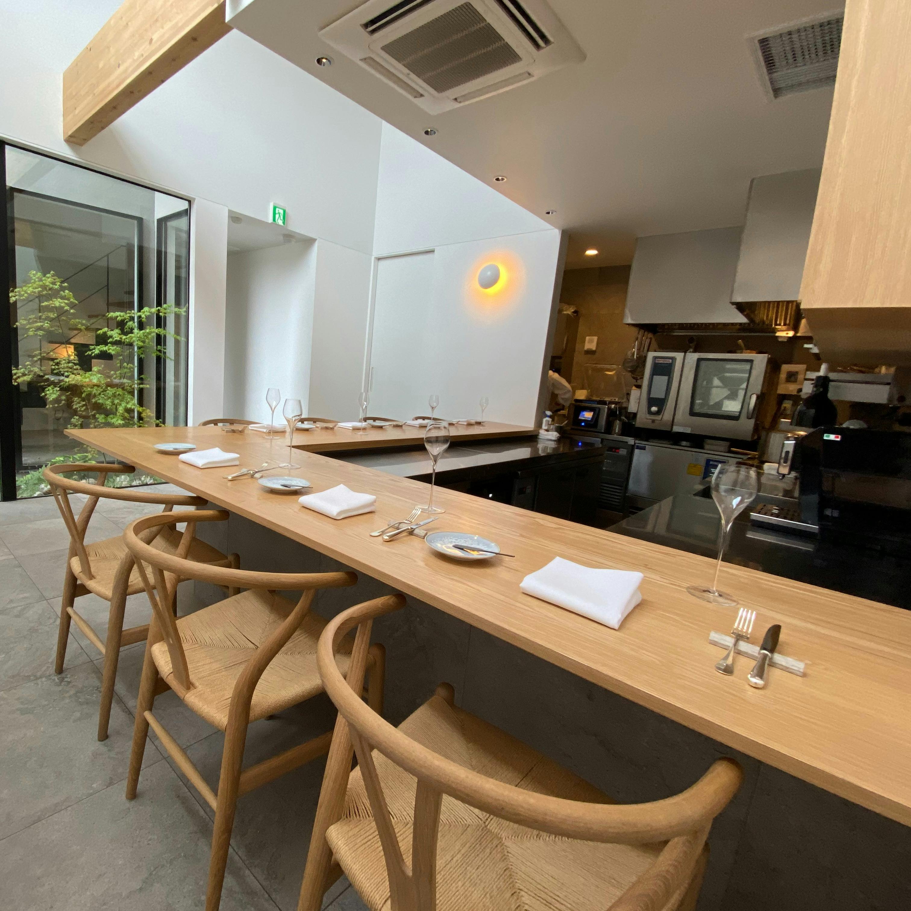 「ゆっくりと落ち着いた空間でお食事を愉しんでいただきたい」という想いから白を基調とした店内は、明るく上質な空間です。ゆっくりとお食事ができるようカウンターは広い造りとなっております。フランス料理をより楽しんでいただくために食器もフランス製にこだわり、クリストフルのカトラリーやオーダーメイドで注文したお皿を使用しております。またトラディッショナルなフランス料理の技術を使いながら日本の食材を取り入れたフレンチレストランで、食材は現地に出向き、作り手の顔が分かる、信頼できる生産者からこだわりの食材を仕入れております。出汁を丁寧にとった上品な味わいを心ゆくまでご堪能ください。