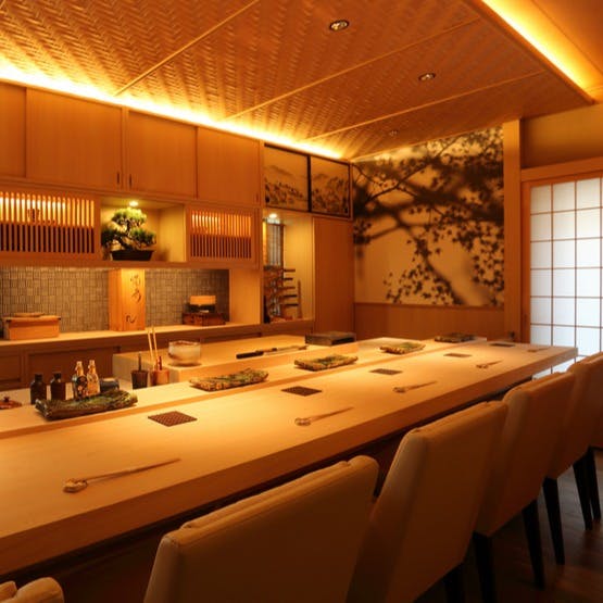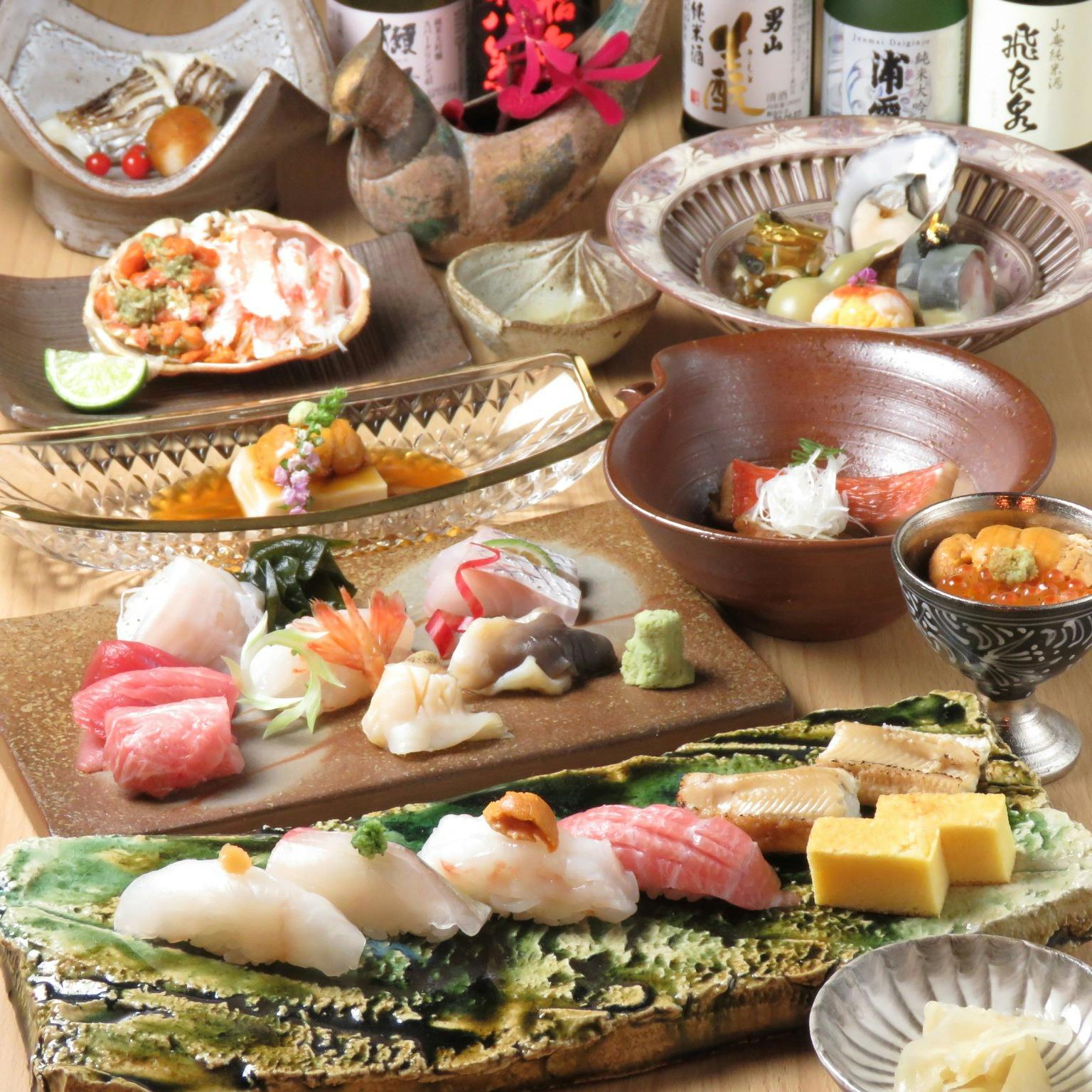 店主自ら市場へと赴き四季折々の食材を吟味し、寿司・日本料理を手掛けています。活で仕入れるタラバガニの身を一つ一つ丁寧にほぐした『冷菜~甲羅盛り』、凜とした気品漂う『前菜』は絶品。『寿司』には、寿司職人としての心意気を感じることができます。素材の持ち味を活かした包丁捌きや調味料選びもまた然り。お酒は、越後鶴亀のワイン酵母仕込みを筆頭にプレミアムな日本酒をラインナップしています。檜の一枚板で誂えられたカウンター、円形の引き戸が印象的な個室など空間すべてがまさに芸術です。素晴らしいひと時をお過ごしください。