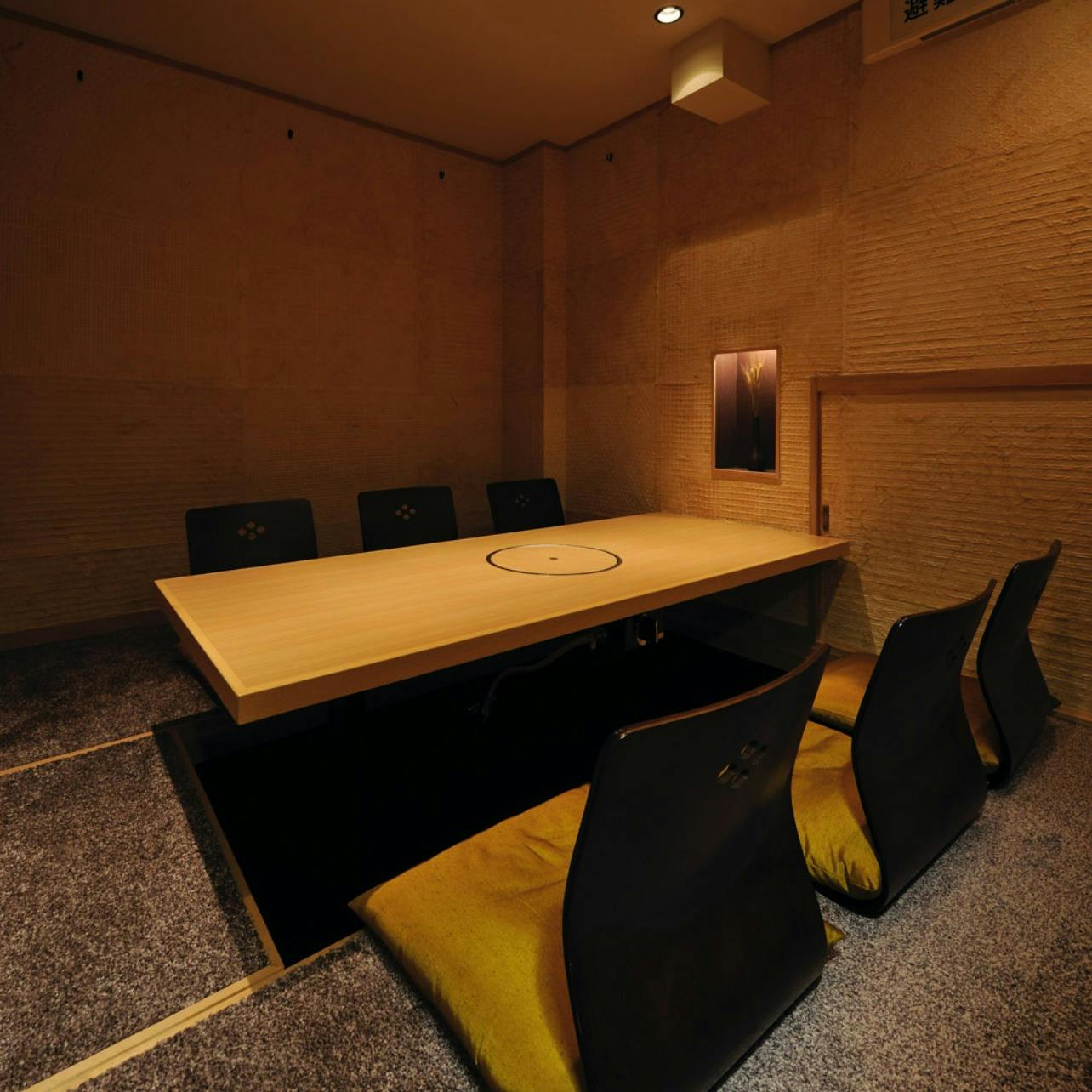 別邸豚道 泉の店内は3フロア構成になっておます。カウンター席、テーブル席、掘りごたつ席、個室といった様々なお席をご用意しており、少人数から大人数の方々、また接待のシーンやご家族連れなど多種多様なお客様のご要望に対応できるお店となっております。