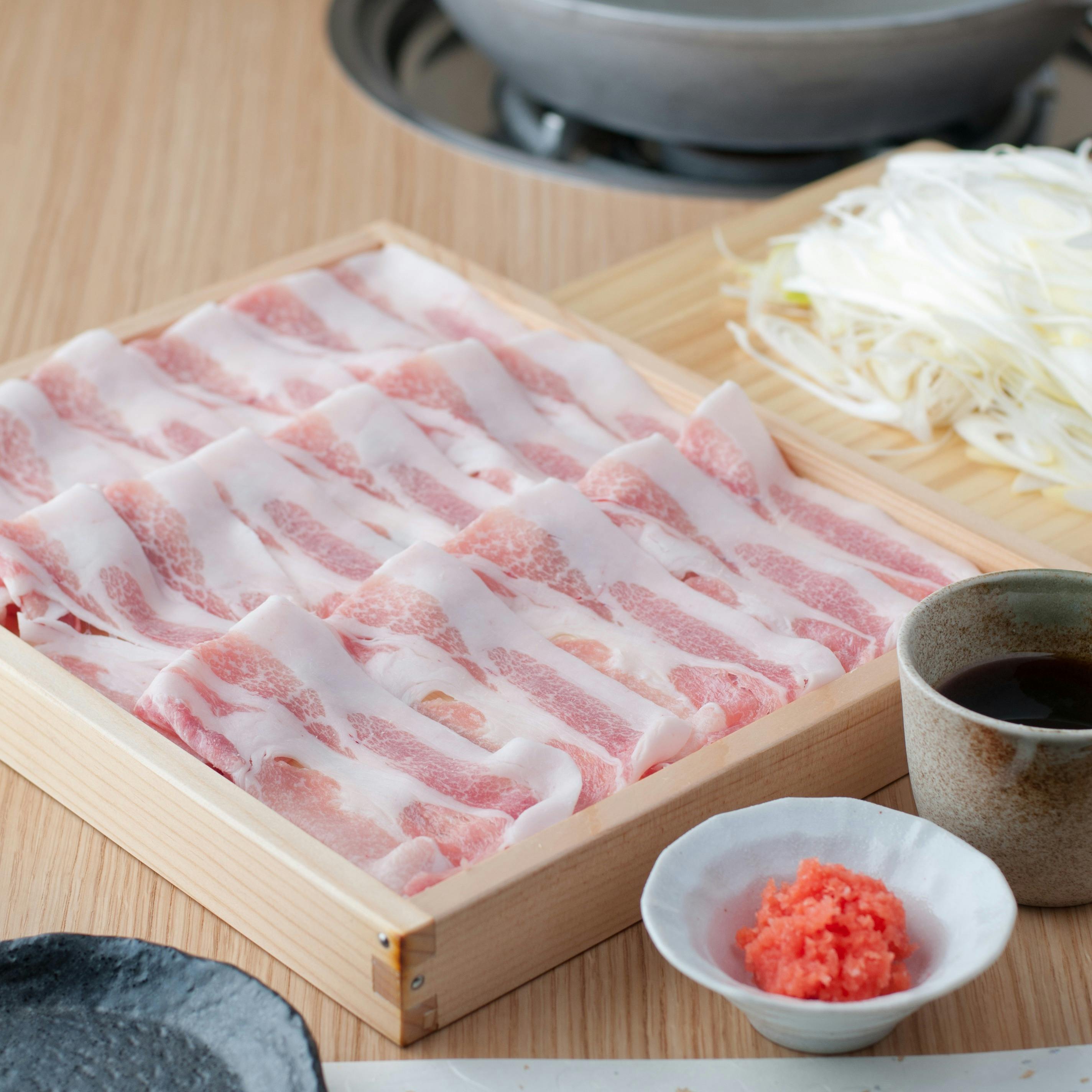 豚道名物の「しゃぶしゃぶ」に使用される豚肉「ボーノポークぎふ」は、岐阜県内の瑞浪市、山県市、揖斐川町にある三農家で生産されています。別邸豚道 泉では、その三農家中の「瑞浪ボーノポーク」のみを使用しております。岐阜県にある関市食肉センター「中濃ミート事業協同組合」にて「と畜、脱骨、整形、カット」されたものを、豚道のスタッフが毎日直接仕入れに行っています。その為、お肉の甘味・旨味が絶品で、常に新鮮で美味しい瑞浪ボーノポークのしゃぶしゃぶをお客様にご提供できるのです。豚肉に自信があるからこそ、豚道はシンプルなしゃぶしゃぶにこだわります。豚道に来たらとにかく「しゃぶしゃぶ」。
