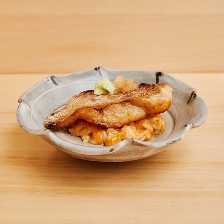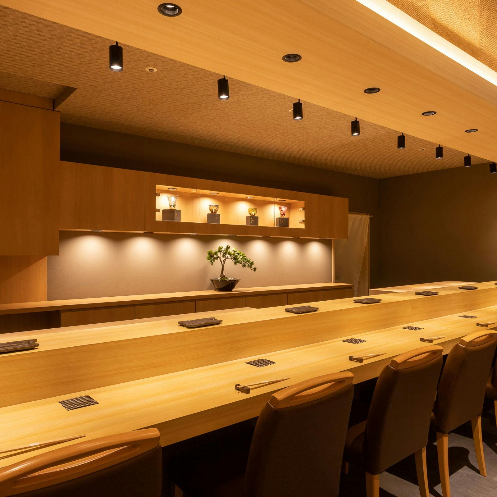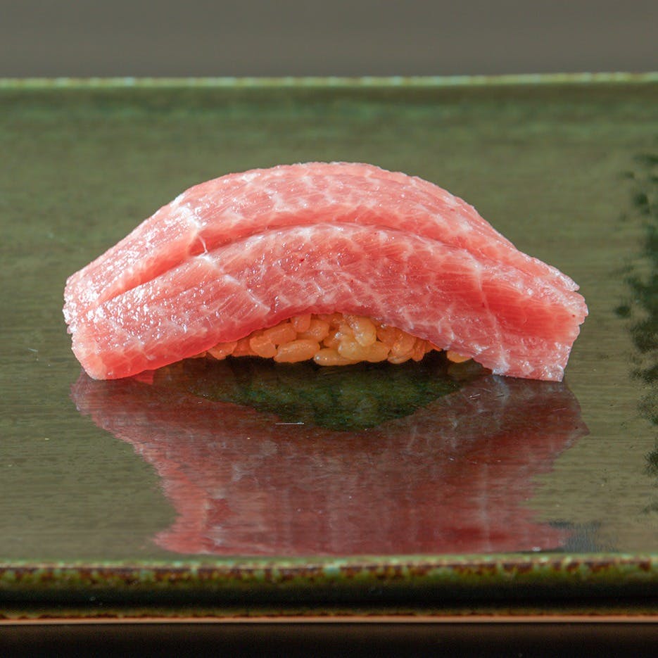 幾多の経験で培った大将の鋭い感性が光る、遊び心溢れたつまみと、伝統かつ正統をゆく江戸前鮨との計算し尽くされた対比が、一つのコースの中で完結。振る舞うのは<おまかせコース>のみ。コースの始まりは、心を解きほぐす、濃厚なシジミのスープからウィットの効いたつまみが続き、お待ちかねの伝統かつ正統な江戸前握りが登場します。大トロの筋部分に自家製塩をまぶした独自の味わい方も「鮨まつもと」ならではの魅力です。
