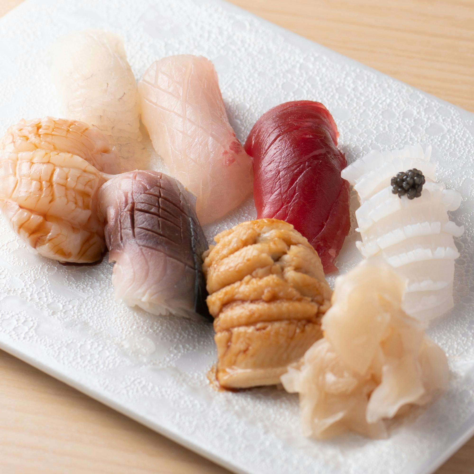【鮨 囃子】では熟成魚を提供しております。 魚は熟成させると旨みが増し、鮮魚とはまた違った魚本来の「究極の旨味」をご堪能下さい。 江戸前の仕事を多く踏襲する中で、魚介の味と香りをより引き出すため試行錯誤を続けています。 すし飯を赤酢で作ったりといった技法も江戸前鮨の伝統を貫いております。 すし飯のお米とお酢(赤酢)、炊き方と調味は特に熟考しました。おまかせコースが基本で、一手間加えて魚の旨味を引き出して食べる江戸前鮨を、是非召し上がって頂きたいです。