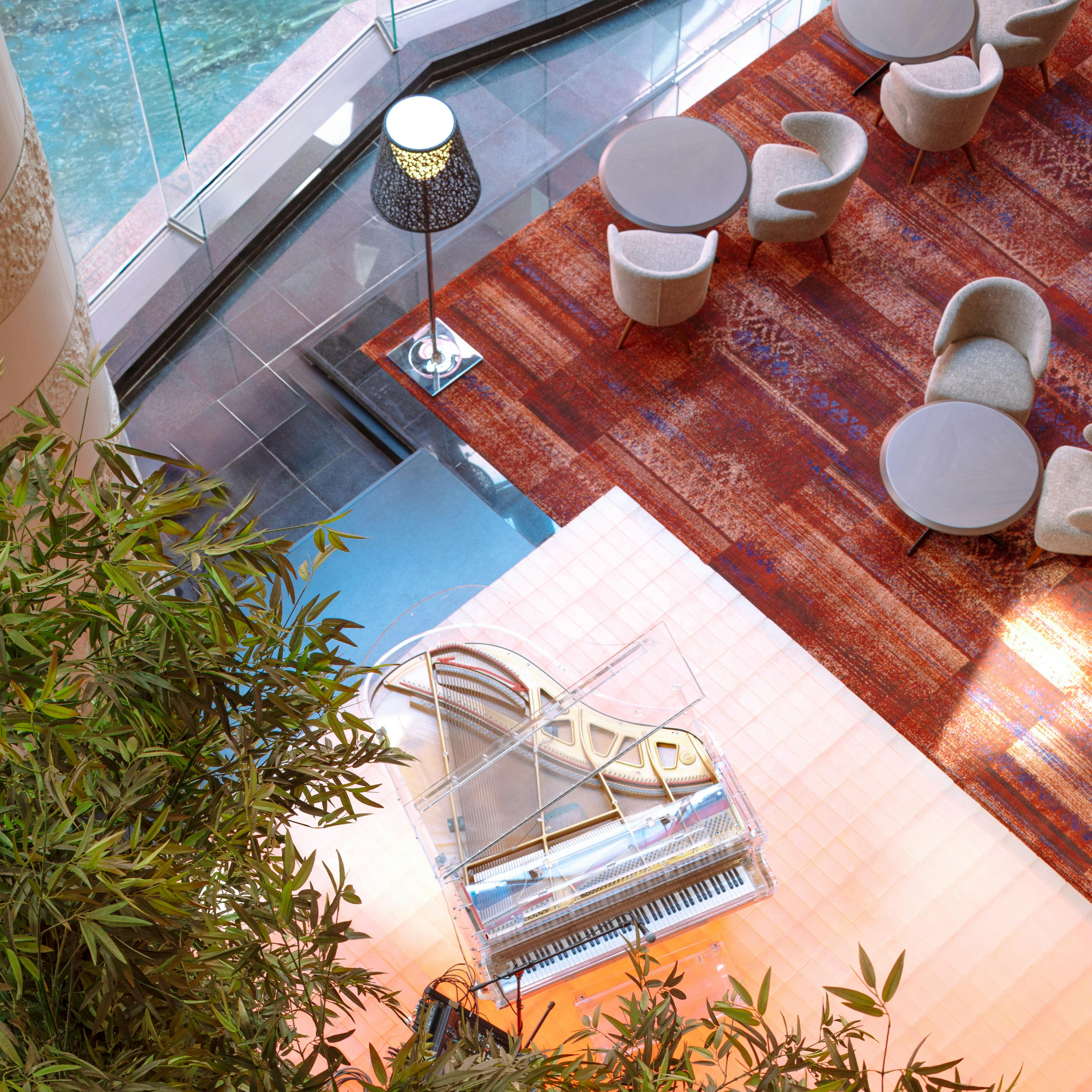 ダイナミックな吹き抜けの空間にモダンなソファが配され、ガラスと水に包まれた開放的な雰囲気のバーラウンジ。ソムリエ、バーテンダー、ティーコーディネーターと多様なプロフェッショナルが集結し、最適な1杯を提案します。