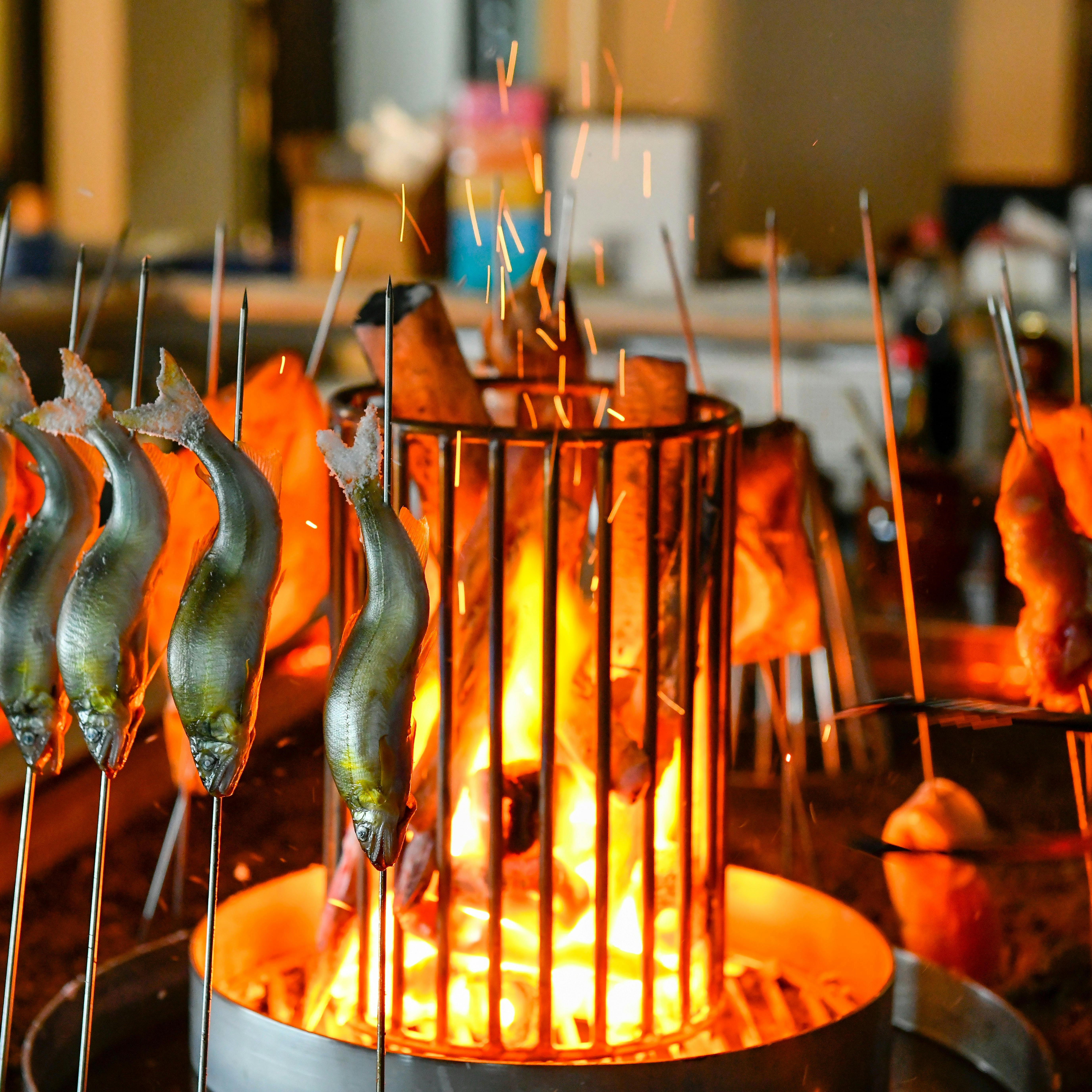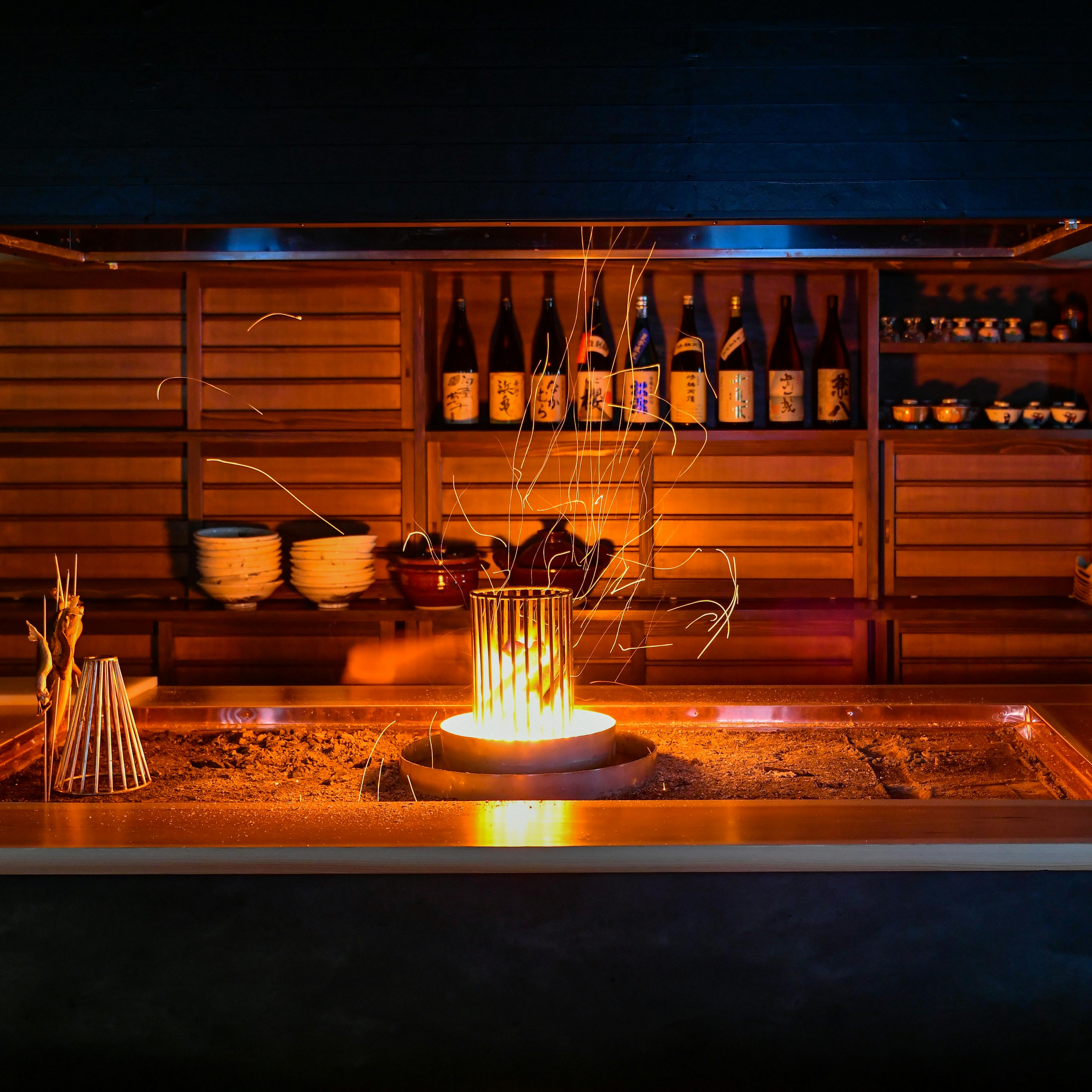 京都らしい和を基調とした雰囲気の店内は、開放感のある落ち着きある空間となっております。大きな囲炉裏が特徴的な店内。お席はカウンター席のみ。旬の食材メインにお料理に使用。京都産の食材を中心に、全国各地からその時々に美味しい食材を仕入しております。囲炉裏で焼き上げる旬の味わいを是非ご堪能下さい.