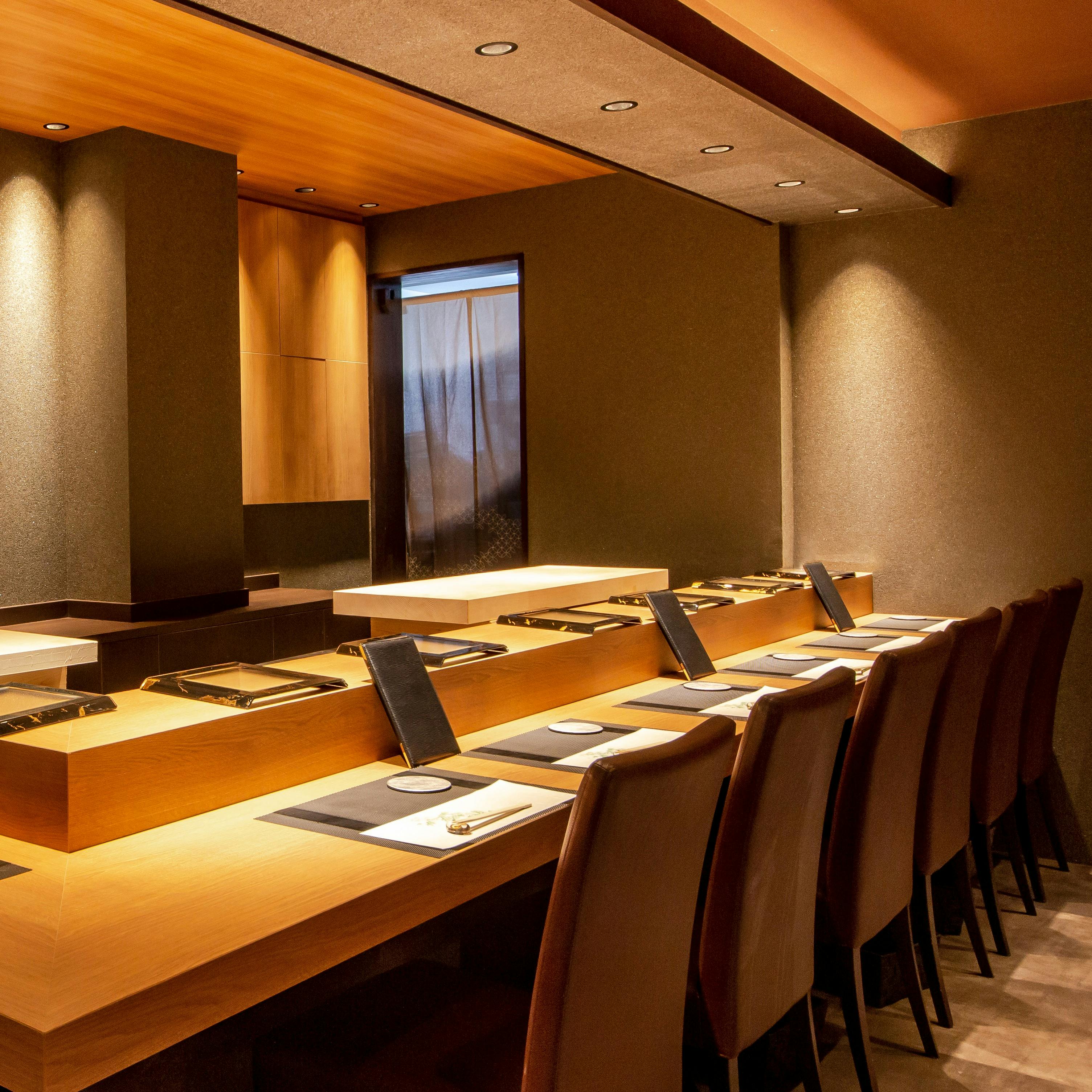 料理長が独自に仕入れた愛媛の地物をご堪能ください。鮨のネタは極上の天然物を使用。その時期にしか味わえない旬の食材を厳選して丁寧に作り上げた逸品料理と熟練の握りを織り交ぜてご提供いたします。長年の研鑽によって培われた流麗な所作で変貌を遂げる芸術的な一皿を一連のコースでお届け。大人の雰囲気を醸し、落ち着きのあるカウンターで正統派本格江戸前寿司をご堪 能いただけます。