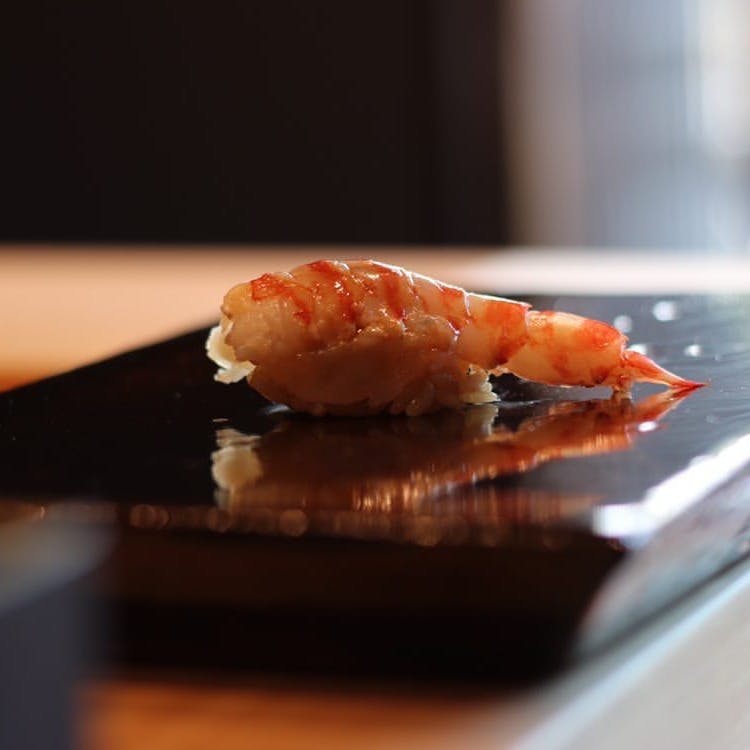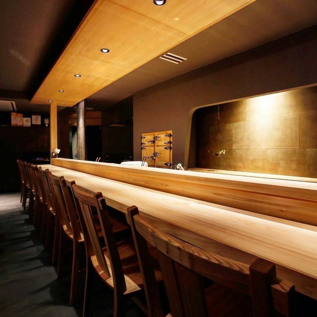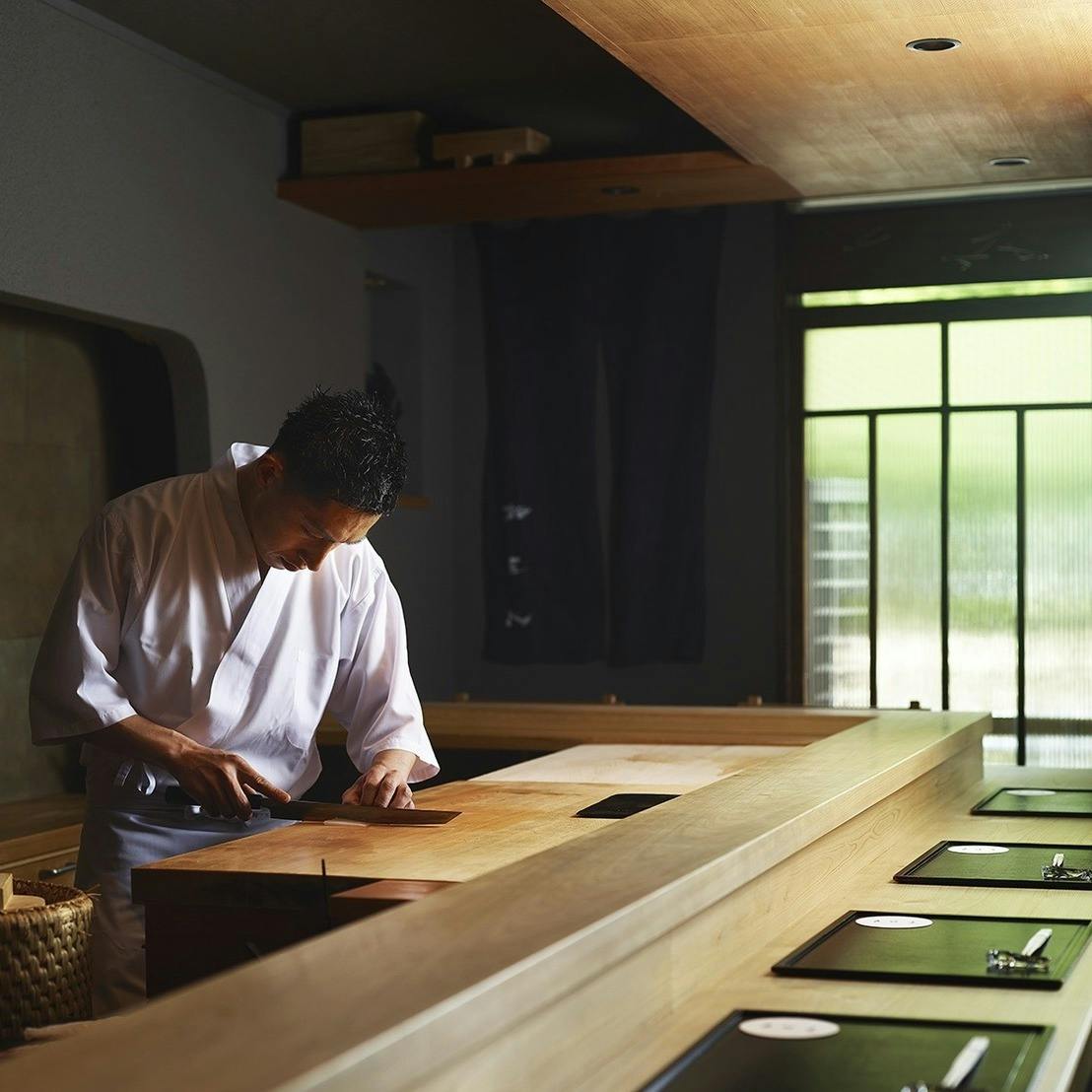 大阪の谷町は空襲で焼けなかった町屋が今でも多く残る土地。「鮨 三心」も戦前から残る五軒長屋にあります。無駄を排したシンプルな店内に、吉野の檜で作られた一枚板の精悍なカウンター。主役である鮨を輝かせるために作られた、光差し込む最高の舞台で、三心の鮨をお楽しみください。