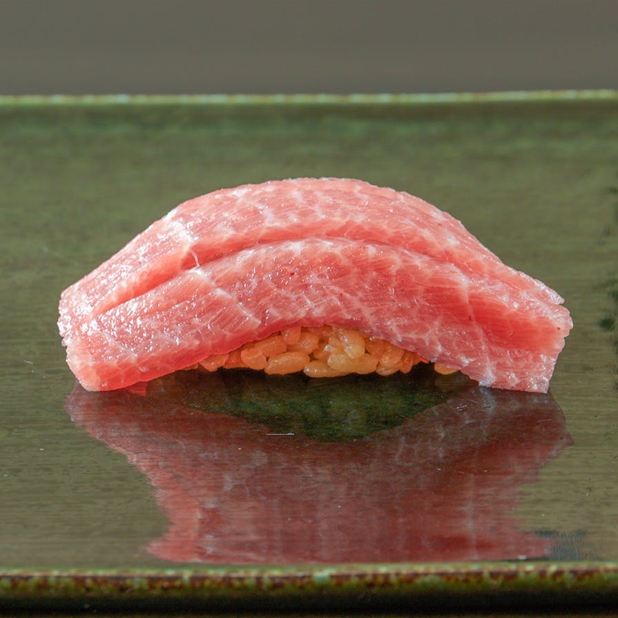 幾多の経験で培った大将の鋭い感性が光る、遊び心溢れたつまみと、伝統かつ正統をゆく江戸前鮨との計算し尽くされた対比が一つのコースの中で完結。 振る舞うのは<おまかせコース>のみ。コースの始まりは、心を解きほぐす、先付やウィットの効いたつまみが続き、伝統かつ正統な江戸前握りへと続きます。是非ご賞味ください。 大トロの筋部分に自家製塩をまぶした独自の味わい方も「鮨まつもと」ならではの魅力です。