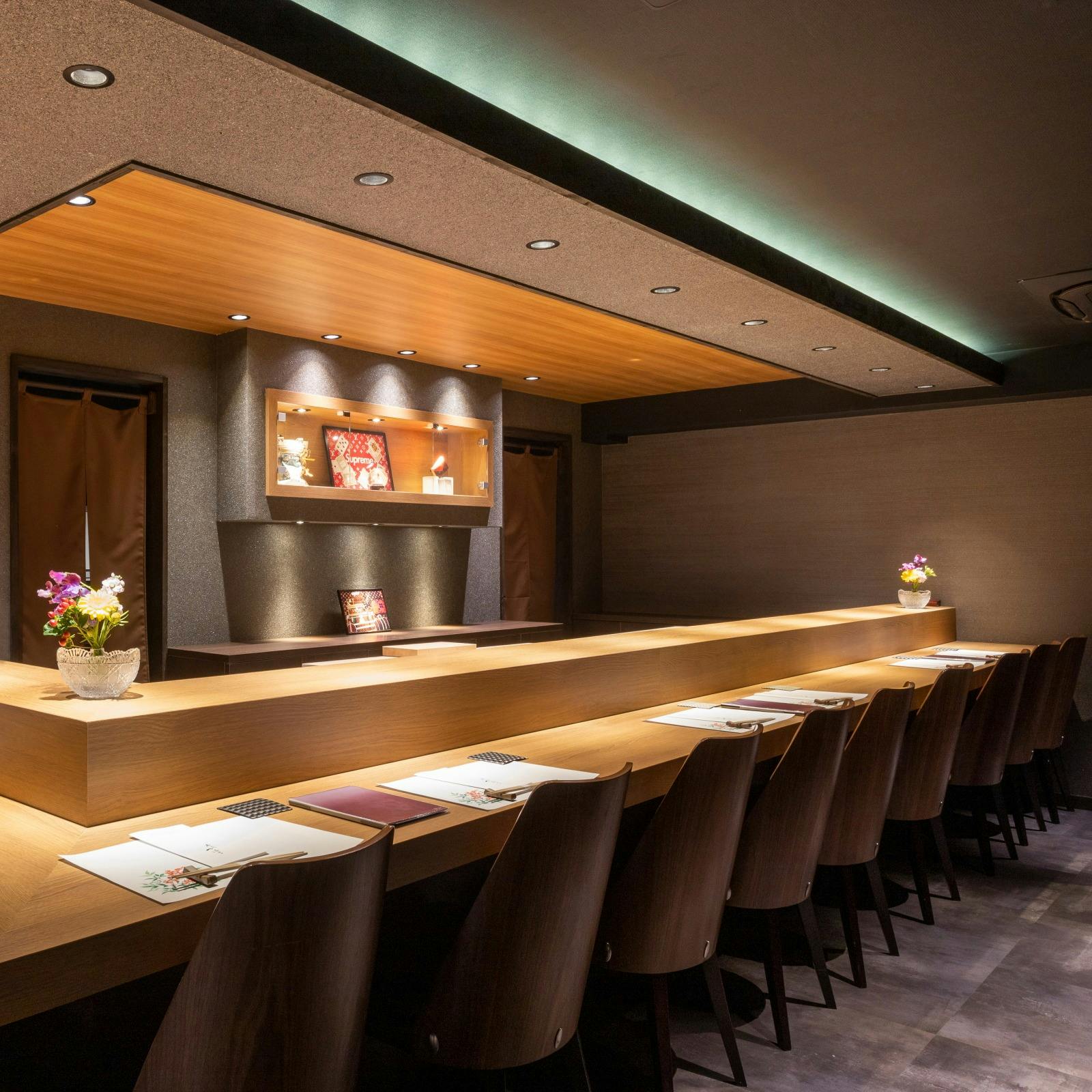 鮨のネタは極上の天然物を使用。その時期にしか味わえない旬の食材を厳選して丁寧に作り上げた懐石料理と熟練の握りを織り交ぜてご提供いたします。長年の研鑽によって培われた流麗な所作で変貌を遂げる芸術的な一皿を一連のコースでお届け。大人の雰囲気を醸し、落ち着きのあるカウンターで正統派本格江戸前寿司をご堪能いただけます。
