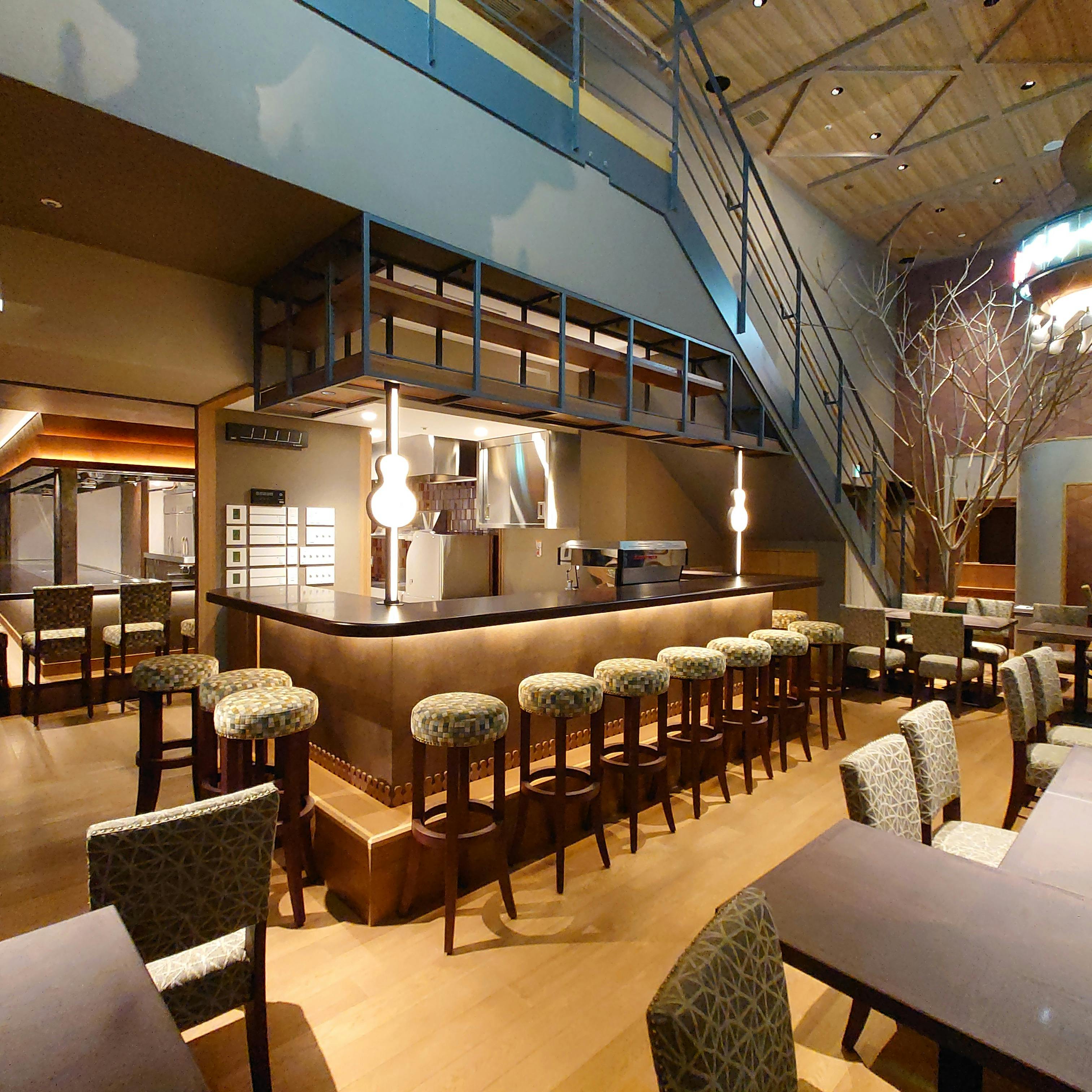 こだわりの蕎麦から鉄板焼き、創作料理まで。バリエーション豊かな食事をお愉しみいただける 実乃里 de バル。店内には、大阪を発展させた豊臣秀吉があやかった縁起物「ひょうたん」をコンセプトに、さまざまな「ひょうたん」デザインがちりばめられ、遊び心溢れる空間となっています。1階には開放的なテラス席とカウンター席、落ち着いた個室もご用意。2階にはテーブル席が並び、ゆったりとお寛ぎいただけます。