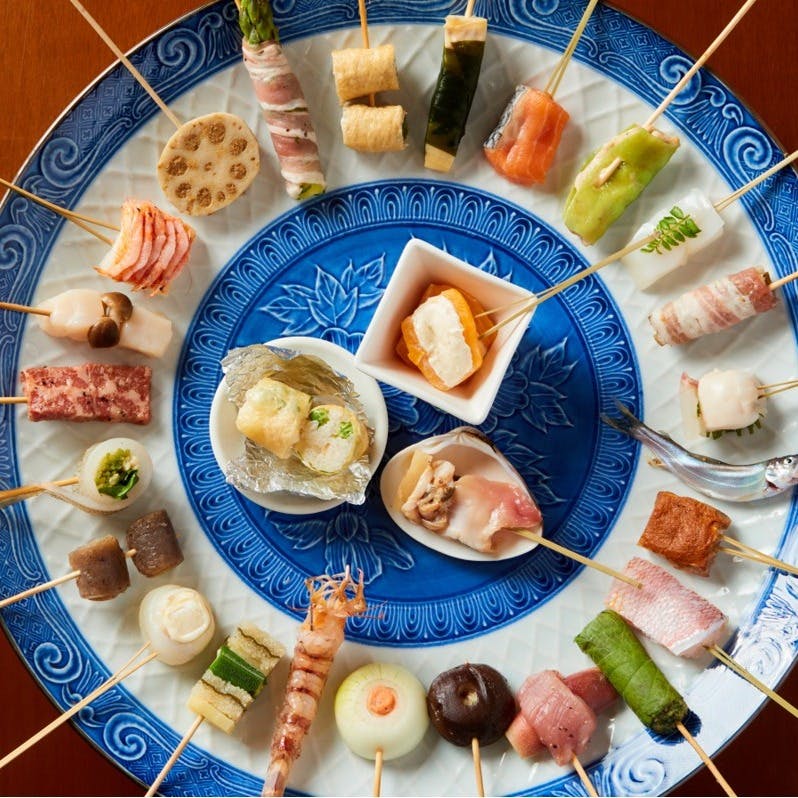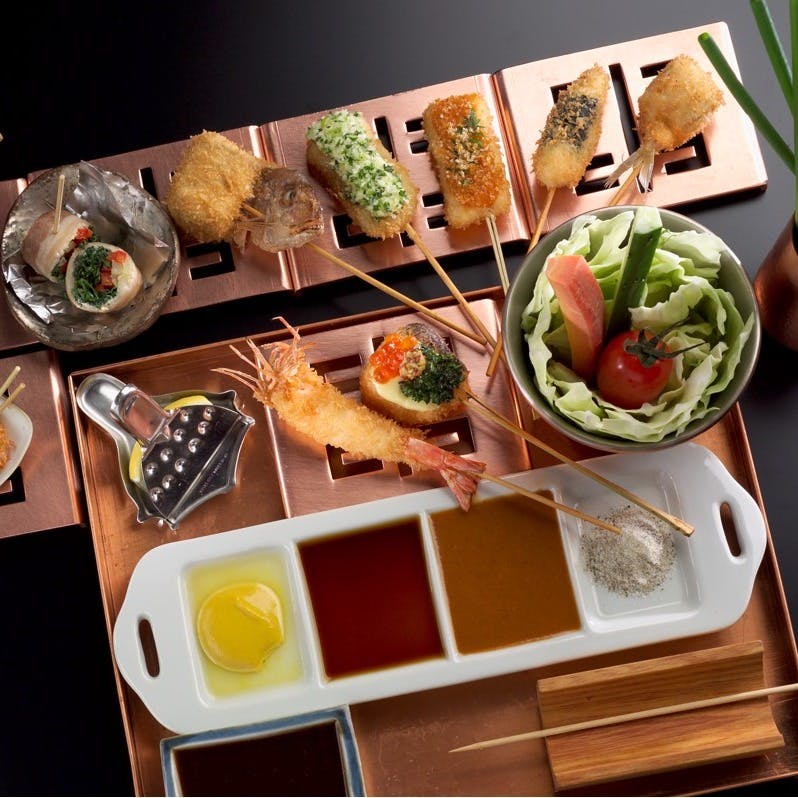 東梅田駅5分。大阪伝統の味を継承し続けること70年以上―。旬の幸を駆使し、食材や季節に合わせて揚げ油を工夫、一本ずつ心を込めてご提供しております。おすすめは、当店が先駆けとなったシステムでお楽しみいただく”おまかせコース”。四季折々の串カツを35種類以上ご用意し揚げたてを順にご提供致しますので、ご満足のところでお声がけください。定番の蛤やしそ巻きはもちろん、季節限定の苺大福も好評を頂いております。