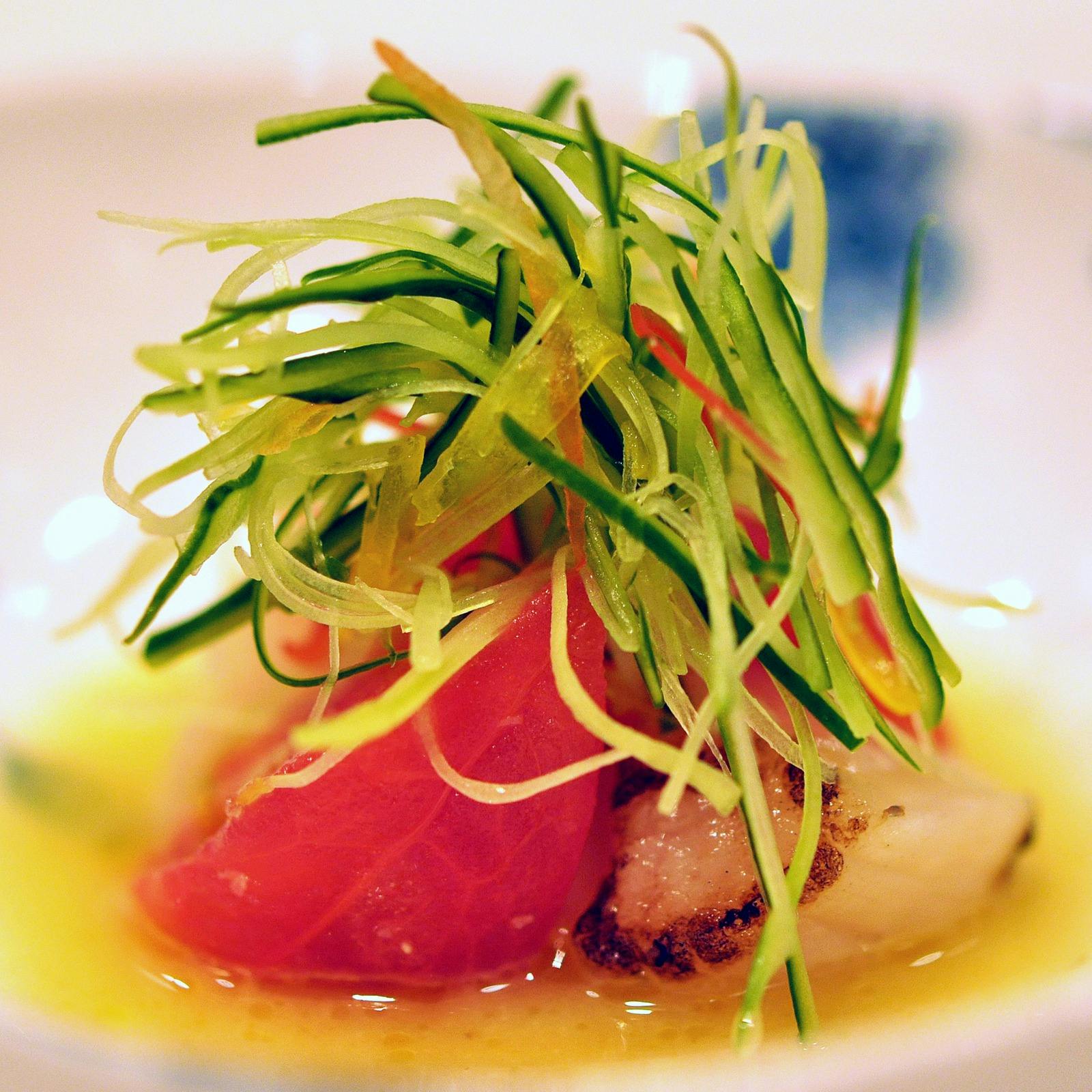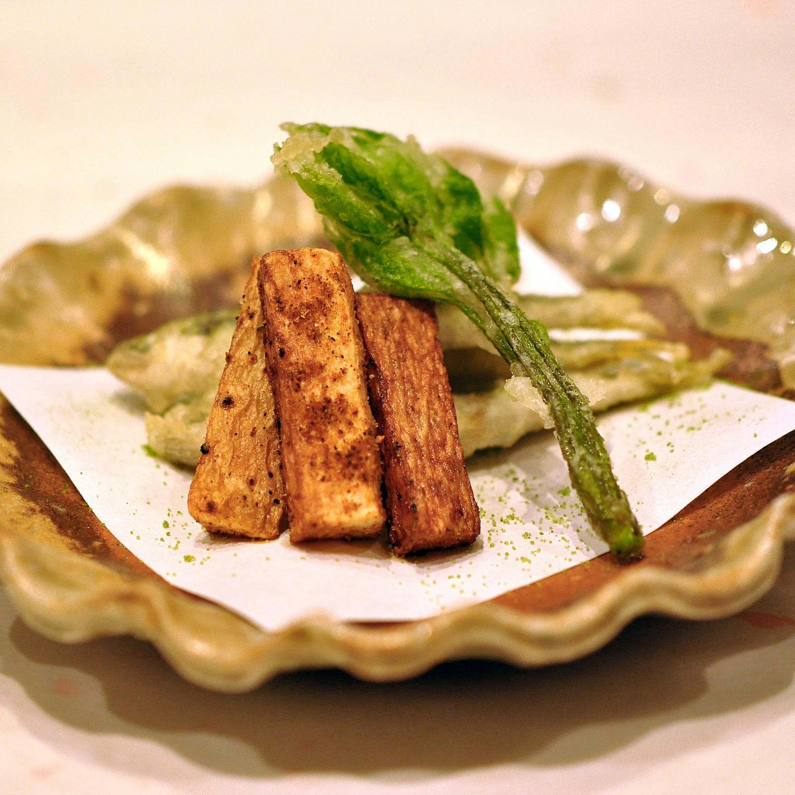 店主の中嶋貞治は、三代続いて一流の料理人という日本料理界のサラブレッド。コースは先付、前菜、御椀と定番の流れですが、供される料理は中嶋独自の工夫が献立の随所にこらされたもの。正統派でありながら意外性のある料理が次々と登場し、一口ごとに驚きと感動が生まれます。包丁技を駆使したお造りに色鮮やかな旬菜の和え物、四季の彩りと日本の美を器に表現した盛り付けの鮮やかさも特筆もの。ゆるぎない日本料理の土台のうえで進化する中嶋の料理は、夜毎美食家の舌をうならせています。