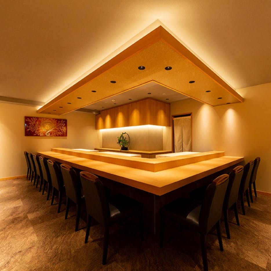 凛とした空気の満ちる店内で、潔く洗練されたカウンターと個室席をご用意しております。会食、接待などのオフィシャル利用、海外ゲストを招いての会にも最適な空間です。ぜひご利用ください。