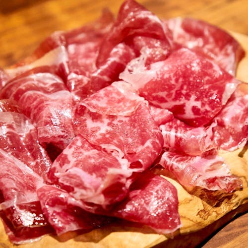 跳牛では佐賀牛のもも肉を塩のみで1年間熟成させた自家製生ハムをご提供しております。豚では出せない芳醇な香りと甘みをご堪能ください。