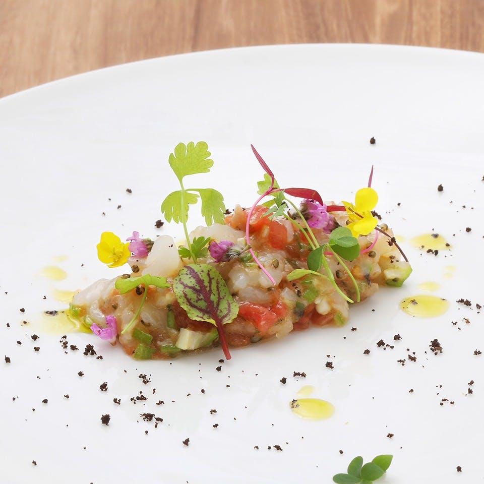都心の喧騒を感じさせない、木目の暖かさを基調とした内装。オープンキッチンを囲むカウンター席は、シェフとの会話も楽しめる特等席。豊洲市場に足繁く通い仕入れる上質の素材を惜しみなくご提供。ドルチェもしっかりと構成したおまかせコースは、再度訪れたくなる魅力ある内容。各地のイタリアワインとともに、ぜひご賞味くださいませ。
