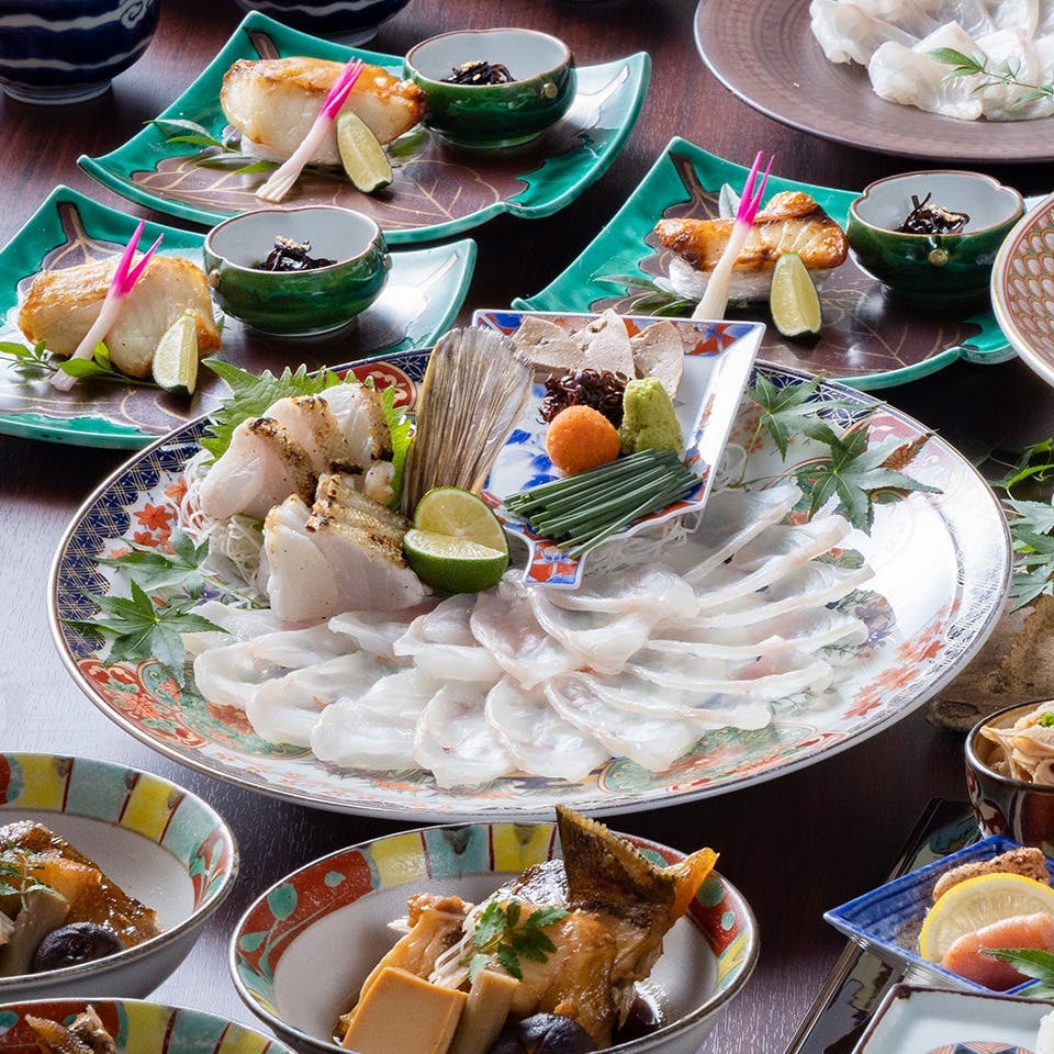 本あら・クエ料理とイカ活き造りと季節の食材を使用した料理をご堪能下さい。席は全席テーブル個室、接待・お顔合わせ・会社宴会様々な用途に合わせてご利用いただけます。