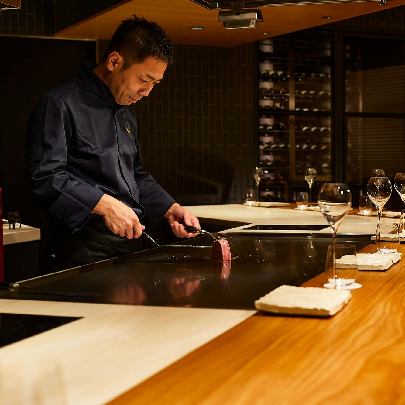 「うしのみや東京」は、日本最高峰と云われる宮崎の牛、その中でも料理長の川原が厳選した「なかにしプレミアスペシャル和牛」のあらゆる部位を活用し、コースを通じて多彩な調理方法で提供する割烹スタイルの鉄板焼業態。
