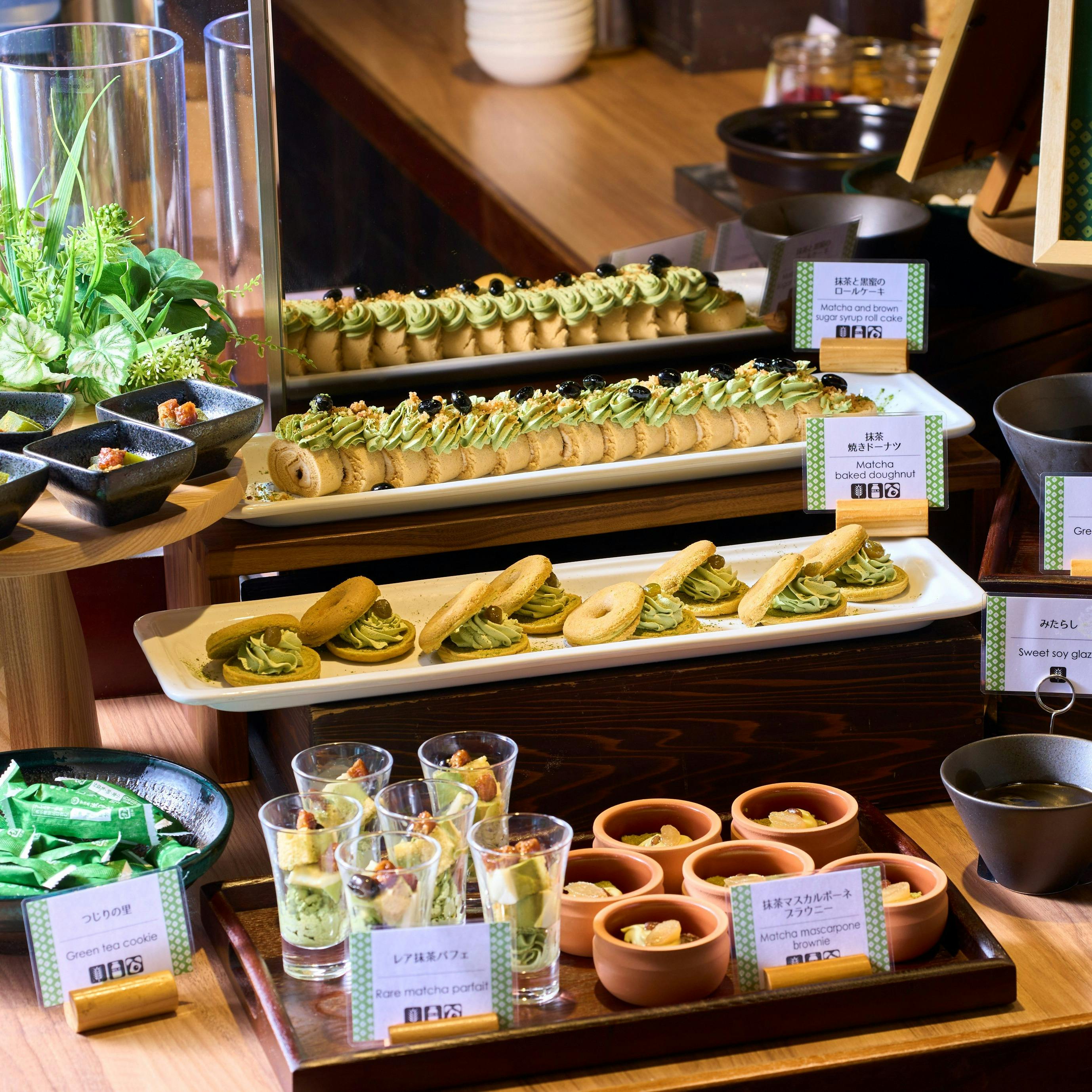 ランチタイムは緑を基調としたスタイリッシュでモダンな雰囲気が広がる店内で、京のおばんざいやお茶等の京都らしさにアジアのスペシャリティをプラスした和洋エスニック料理をビュッフェ形式でご用意しました。 ご家族のお集まりや女子会、歓送迎会など様々なシーンでぜひご利用ください。