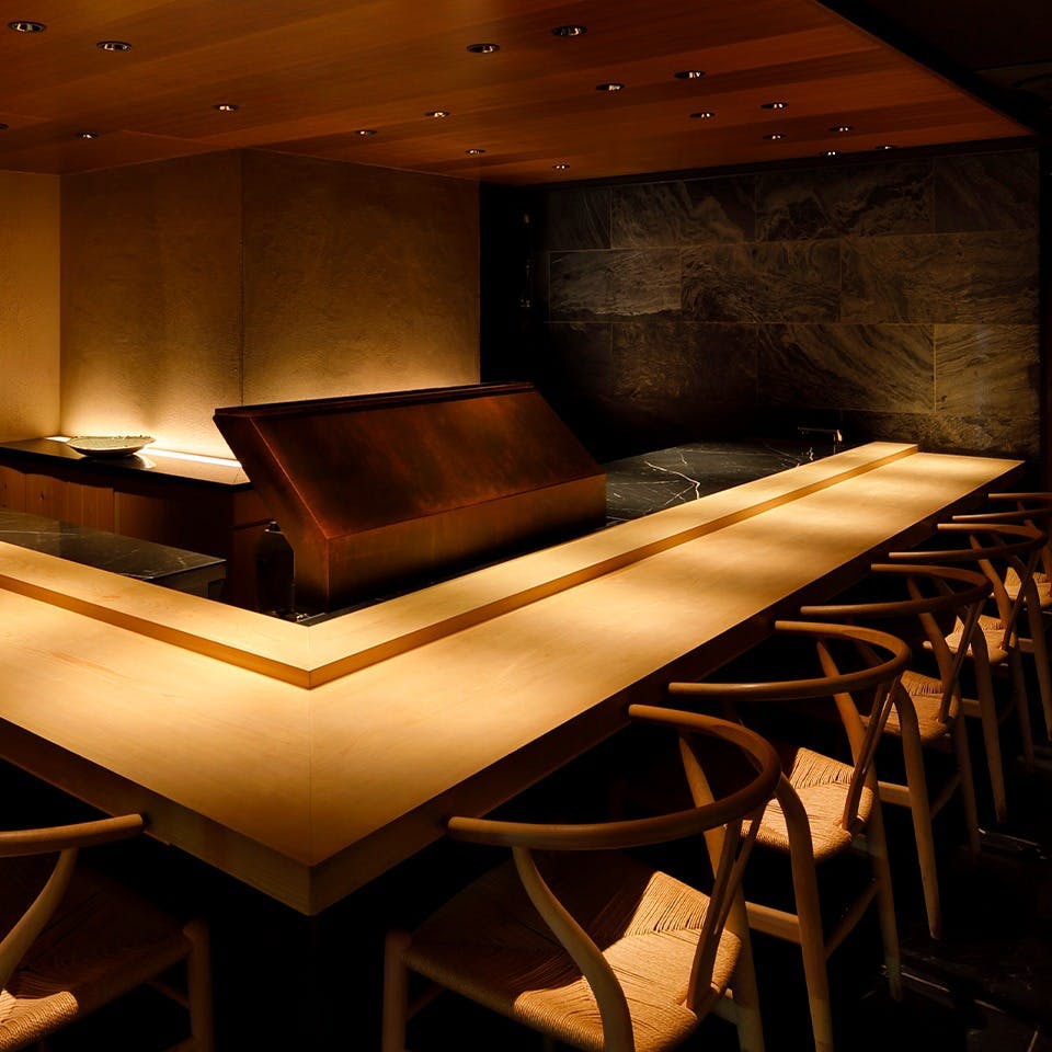 温かく優しい光でライトアップされた店内。11席のカウンターには樹齢二千年の檜を使用し、プライベート空間を大切にした4名まで利用可能の完全個室もご用意しております。デートや接待、記念日の食事などさまざまなシチュエーションでご活用いただけます。