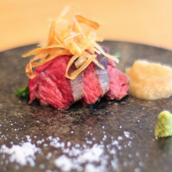 柔らかい霜降りの味彩牛や天草の鮮魚など、旬の熊本食材を様々な調理法でご提供。見た目も美しい手作りの逸品をしっとりとした和空間でご堪能ください。季節によって顔ぶれが異なる日本酒が約15種。ノンアルコールドリンクも好評です。