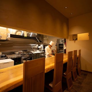 JR守山駅周囲の喧騒無縁の静かな住宅街。カウンターは分厚く風格ある秋田杉、2つの個室は掘りごたつで、落ち着きの中に肩の凝らない親しみやすさがあります。フルオープンのキッチンは、隅々まで徹底して磨き抜かれ、光り輝く清潔感も料理に対する真摯な姿勢を映し出す鏡のよう。セラーには20年前後も熟成したボルドーや、気鋭生産者の自然派ワインも充実。ともに、料理同様の良心価格なものもご用意しております。