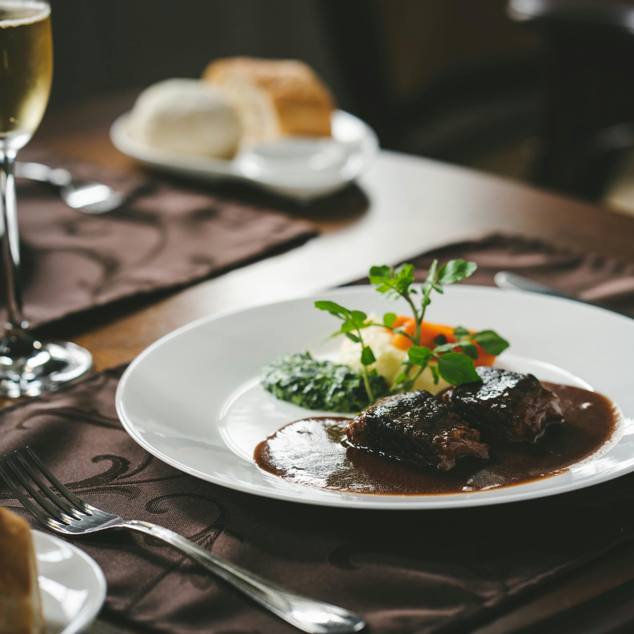 大正10年築の、元は銀行だったという歴史的建築物を改装し、レストランとして営業しているお店。当時の建築様式をそのまま残す落ち着いた空間で、『黒毛和牛のブラウンシチュー』『播州百日鶏のホワイトシチュー』の2種を中心としたコース料理を提供。パン職人として東京で修業を積んだシェフによるこだわりパンも人気です。ランチやお子さまランチなどもあり、ご家族の記念日、デート、女性グループの会食など、きちんとしたお食事を楽しみたい方に最適です。建物とは対照的に、スタッフは若い力が集結。「老舗創生」をテーマに若者が新たな歴史をつむぎ、未来へつないでいくエネルギッシュなスポットとしても注目を浴びています。