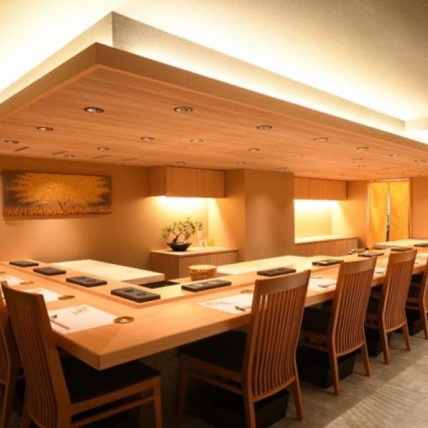 鮨のネタは極上の天然物を使用。その時期にしか味わえない季節の食材を厳選して丁寧に作り上げた懐石料理と熟練の握りを織り交ぜてご提供いたします。長年の研鑽によって培われた流麗な所作で変貌を遂げる芸術的な一皿をコースでお届けいたします。大人の雰囲気を醸し、落ち着きのあるカウンターで正統派本格江戸前寿司をご堪能いただけます