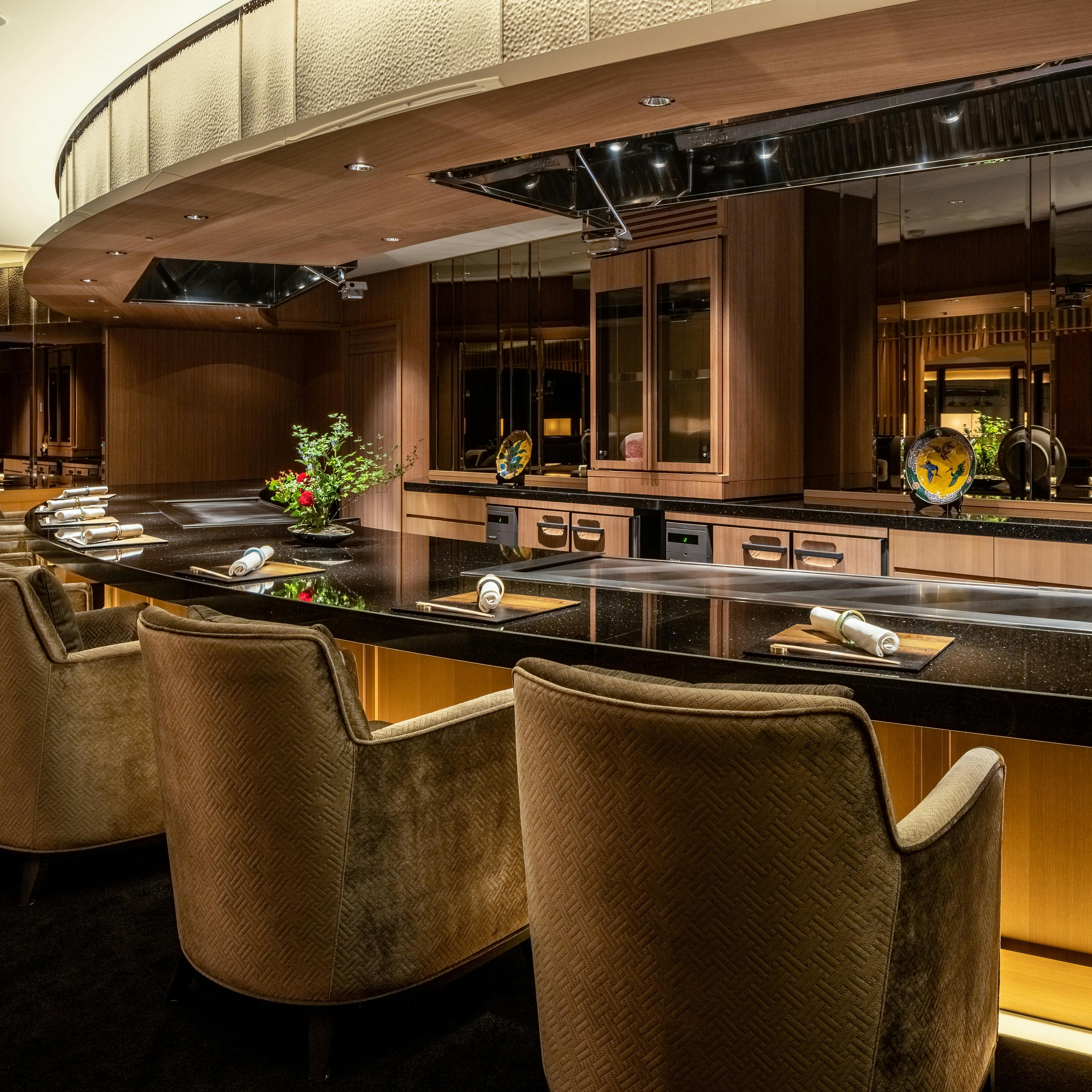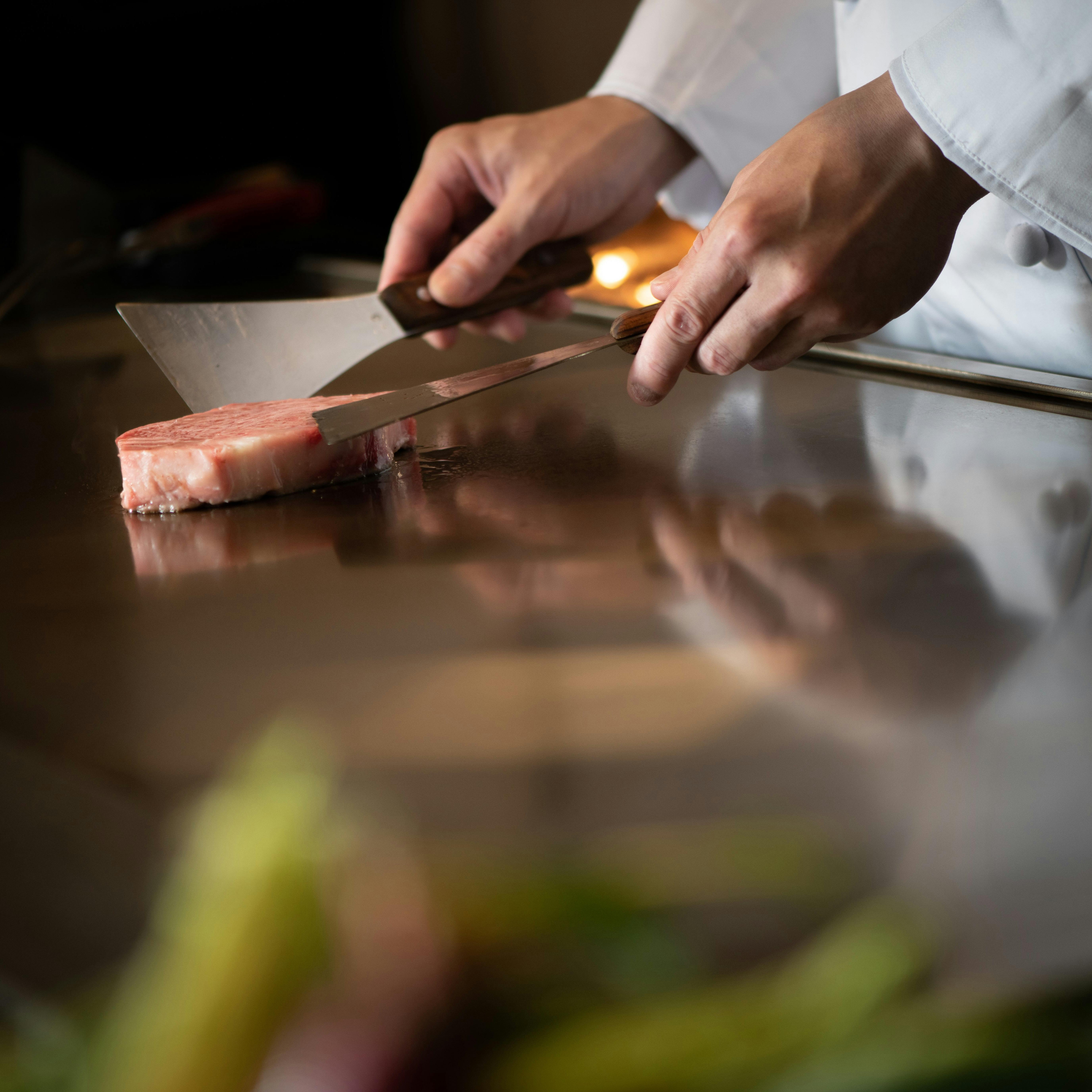 最上級の国内銘柄牛に地元の食材を厳選してご用意。目の前で音を立てて焼ける肉や魚介、鉄板から立ち上る香り、そして焼き手の見事な手捌きと仕草が、きっと心躍らせてくれることでしょう。洗練された味と技が織りなす一品で至福の時をお届けいたします。