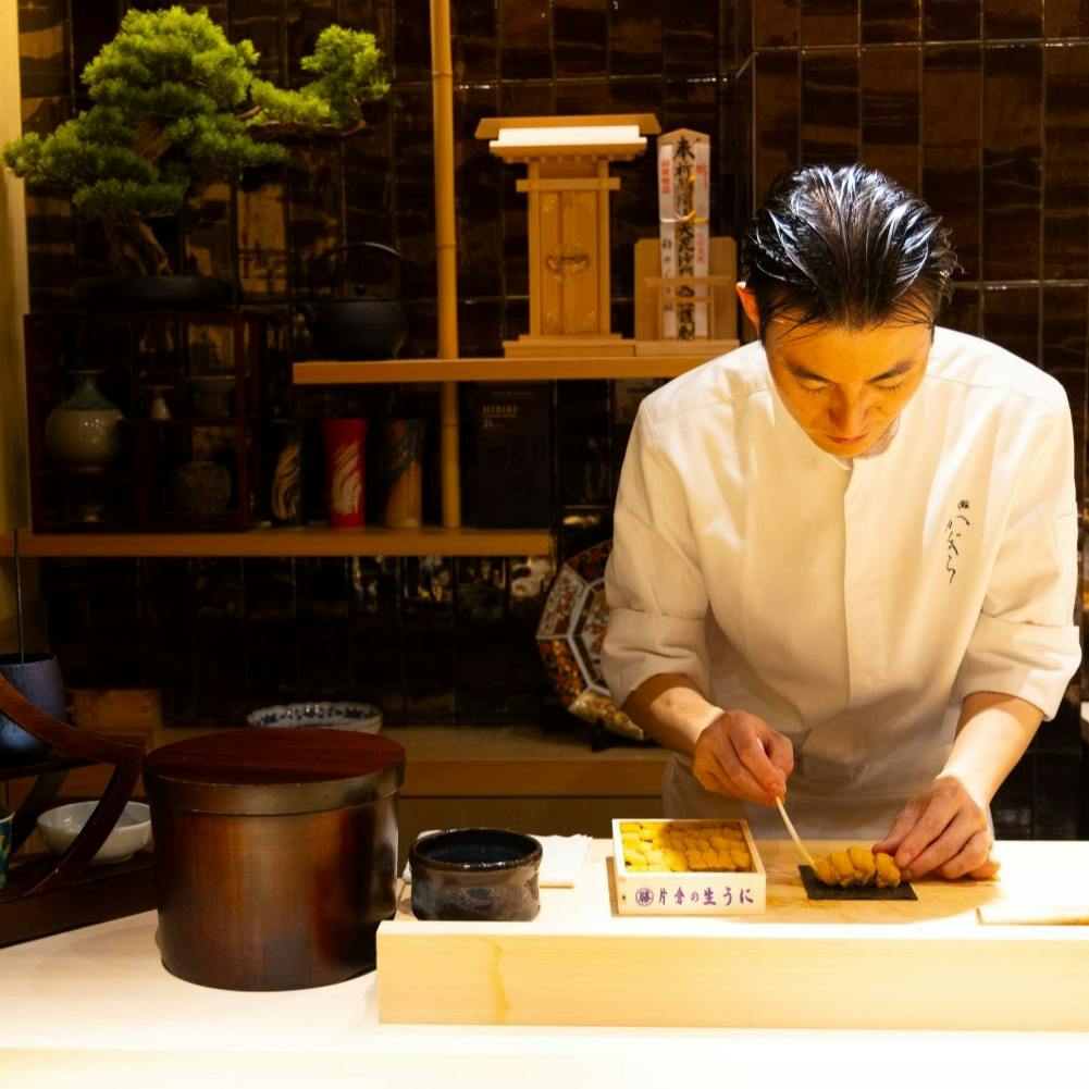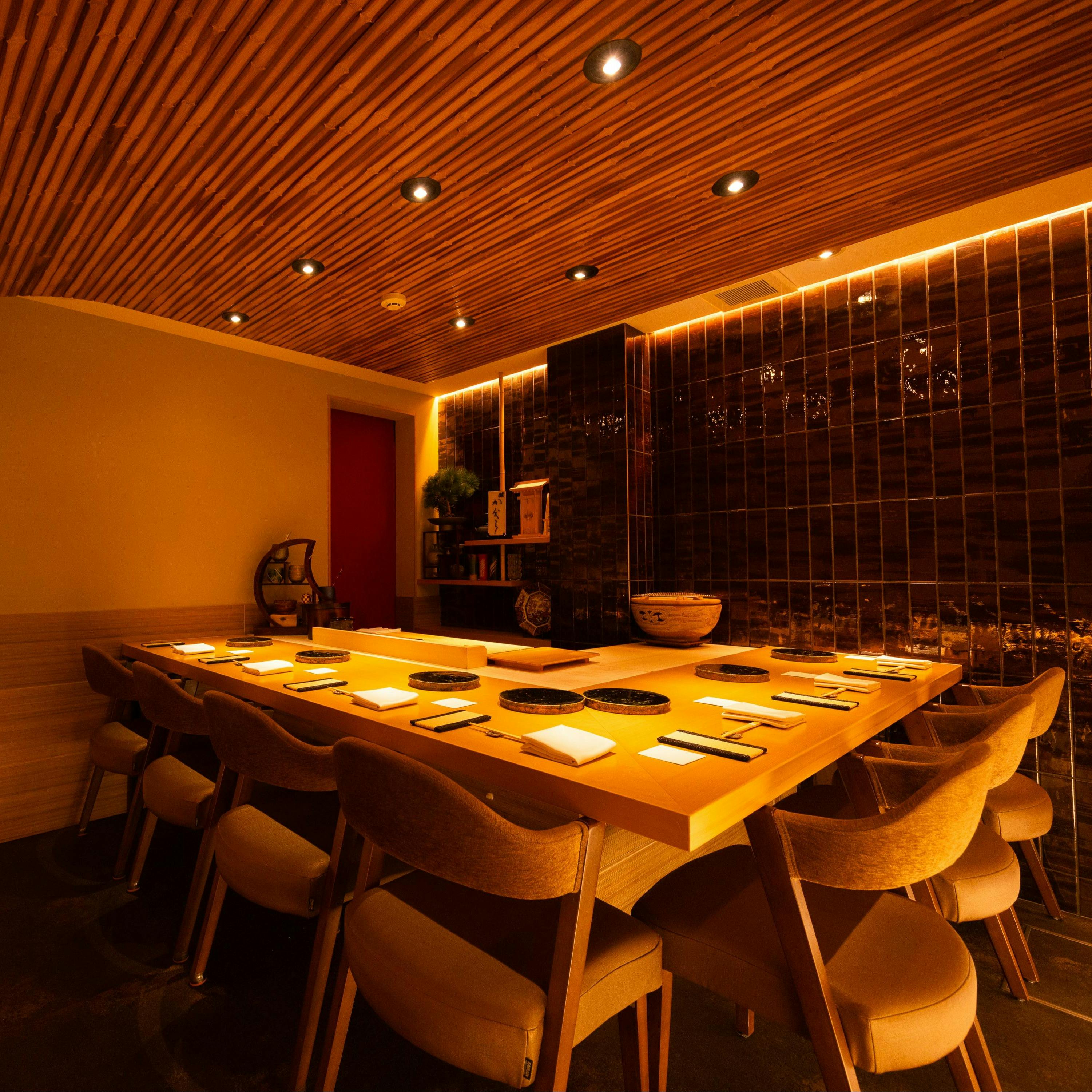 食材との一期一会を大切に、大将自ら豊洲市場で目利きし入手する季節の食材、そして時には産地から直接仕入れている四季折々の食材。 旬は走り・旬・名残と移り変わり、その味わいが高まるような調理で美味しさを昇華させています。 焚きあげからシャリ切りまで、神経を研ぎ澄まし整えて調合・形成した舎利。 拘りに拘った幻想的な空間で四季折々の素材から生み出される非日常のおいしさを、大切な人と共にゆっくりと堪能して下さい。
