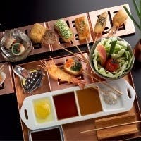 大阪伝統の味を継承し続けること70年以上―。旬の幸を駆使し、食材や季節に合わせて揚げ油を工夫、一本ずつ心を込めてご提供しております。おすすめは、当店が先駆けとなったシステムでお楽しみいただく”おまかせコース”。四季折々の串カツを35種類以上ご用意し揚げたてを順にご提供致しますので、ご満足のところでお声がけください。定番の蛤やしそ巻きはもちろん、季節限定の苺大福も好評を頂いております。
