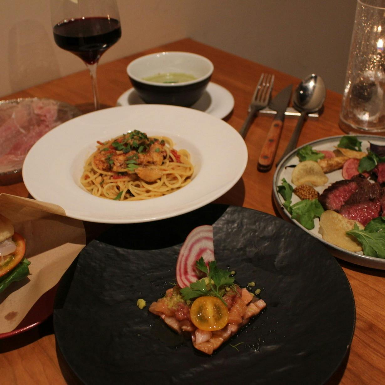 炭火焼きのお肉と手打ちパスタ、毎朝届く自家農園産野菜を使った数々のお料理をお楽しみ頂けます。月1で内容を更新する“本日のコース(4950円)”は、シェフお勧めの全7品をご提供しています。また、カリフォルニアワインは常時100種類以上をご用意。温かみのある大人な雰囲気の店内には、カウンター席やテーブル席のほか、完全個室も完備しています。お一人様はもちろん、ご家族連れやデートシーンにも最適です。