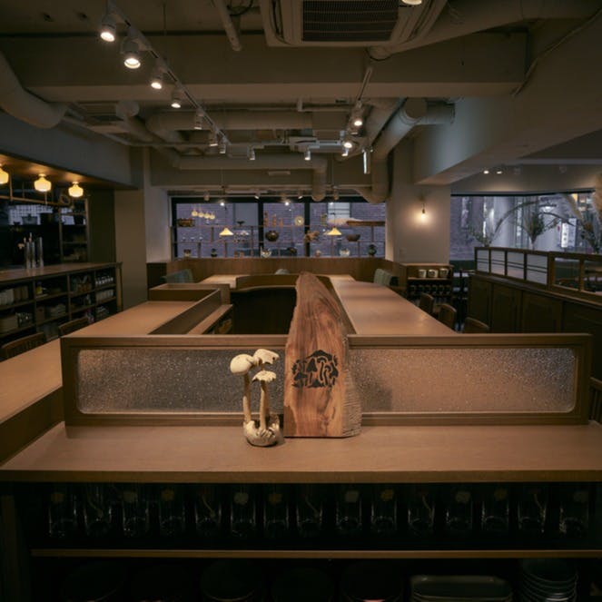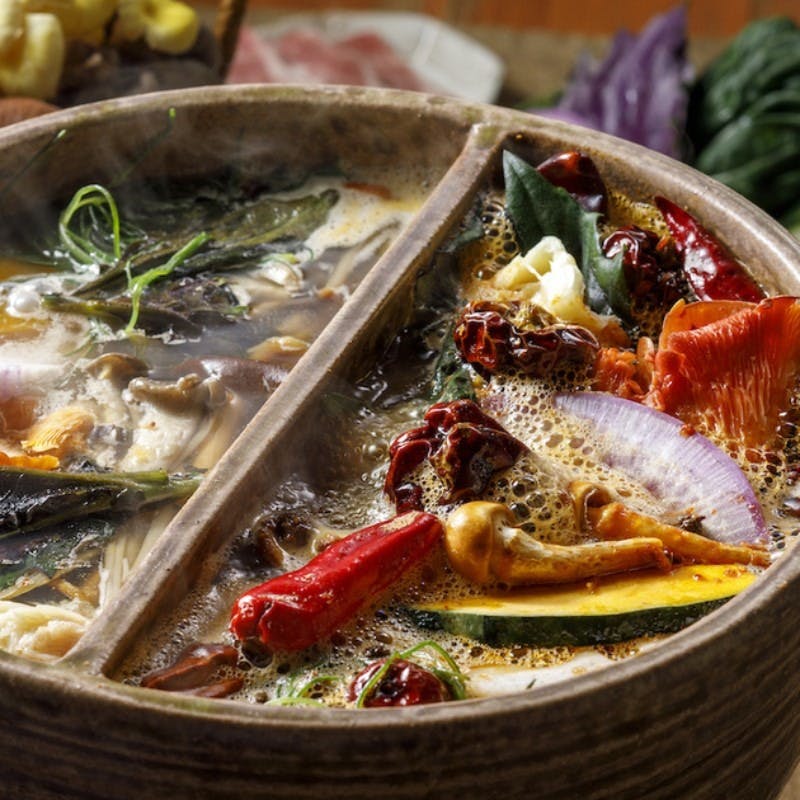 当店のスープは2種類。薬膳きのこスープと麻辣スープ。昆布出汁と新鮮なきのこを掛け合わせるとうちでしか楽しめないスープの出来上がり。「きのこ火鍋」は常時10~12種の新鮮なきのこをぎゅっと詰めこみました。ヘルシーでありながら深い味わいを。きのこそれぞれに食感や味わいに個性があり、楽しめます。スープは育てていくのも楽しみの一つ。タレ場には約20種類の薬味があり、自分色を探してもらえること間違いなし。