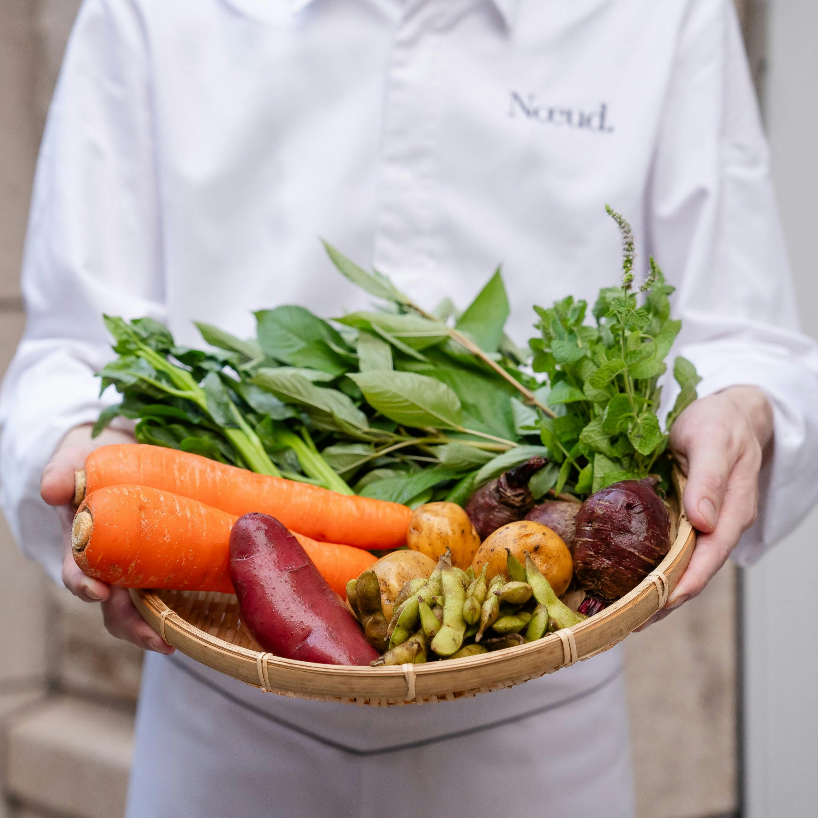 食材選びはすべておまかせ。実際に足を運び、現場を見、お話を伺った、こだわりの生産者の皆様から届くのは「今この瞬間おいしいもの」。旬を迎えた鮮度抜群の食材をどう組み合わせてどう調理するのか、シェフの構想が始まります。馴染みのある食材がどんな変化を遂げるのか、一種類の食材がどんなバリエーションに富むのか、そのわくわくを是非五感でお楽しみください。遊び心溢れるひと皿をお届けします。