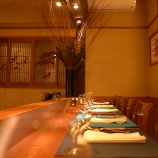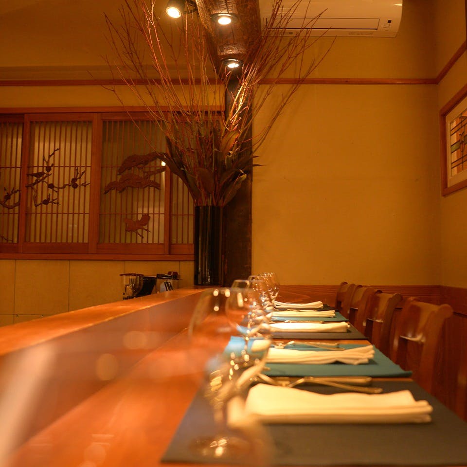入口をくぐるとカウンター席が広がっております。 温かみのある空間でこだわりの料理をお楽しみ下さい