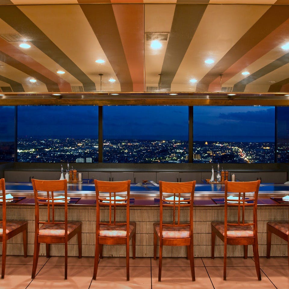 眺望と鉄板焼パフォーマンスを目の前で楽しめる鉄板焼き店“鉄板焼「さざんか」”。当店は黒毛和牛にこだわっております。お肉はもちろん、魚介や旬の野菜にもこだわっており、四季を感じることができるメニューも魅力です。ランチタイム、ディナータイムともにご提供しているこだわりの自家製ガーリックライスも、ぜひ一度ご賞味下さい。
