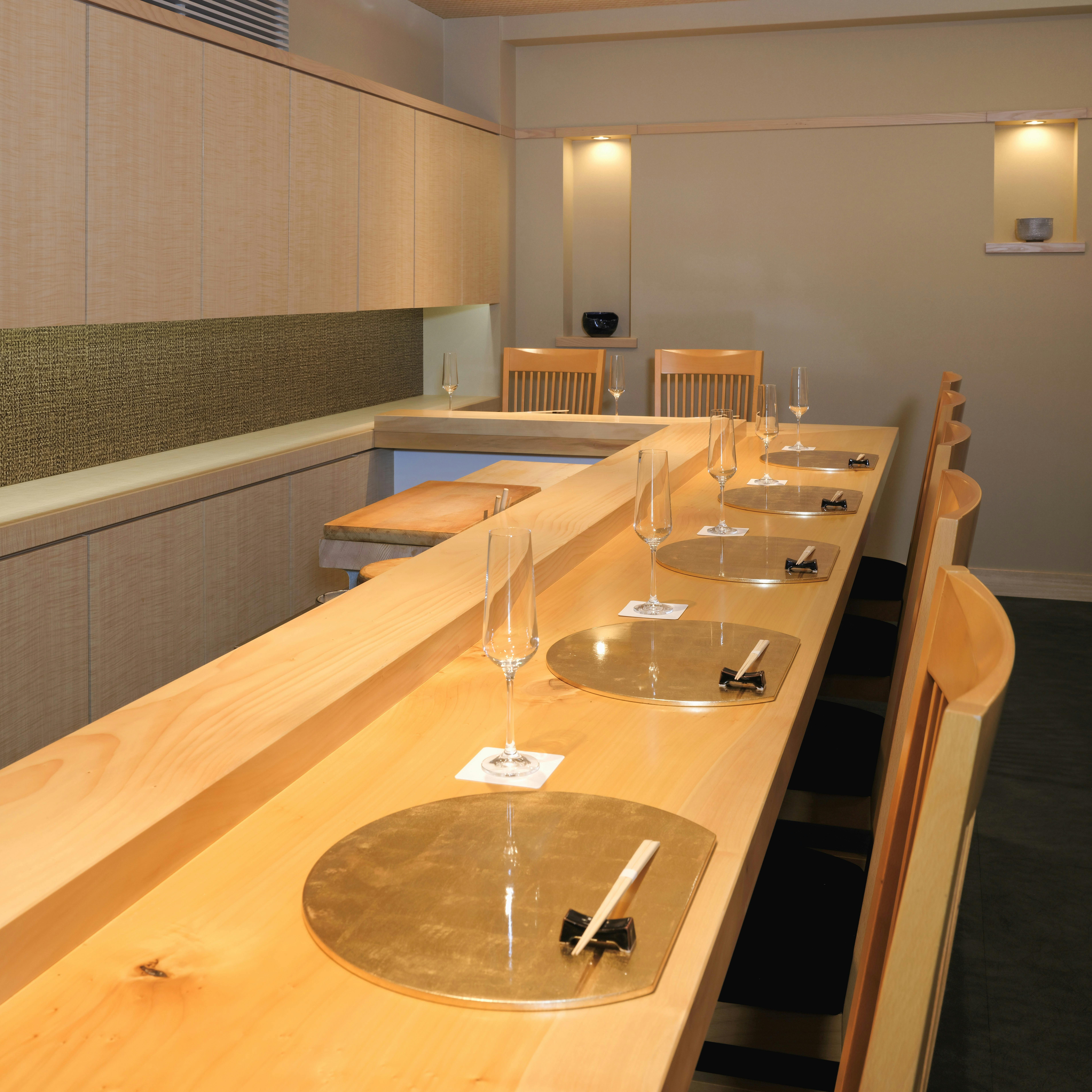 店内はカウンター席のみで、どの席に座っても料理人が寿司を握る姿を見ながらお食事をお愉しみいただけます。 その時、一番美味しい季節のネタをおまかせコースで提供しております。 握りはもちろん、おつまみ、一品料理など食材の旨みを活かす最適な調理法でお楽しみいただけます。 美味しいお酒と共に心ゆくまでご堪能ください。