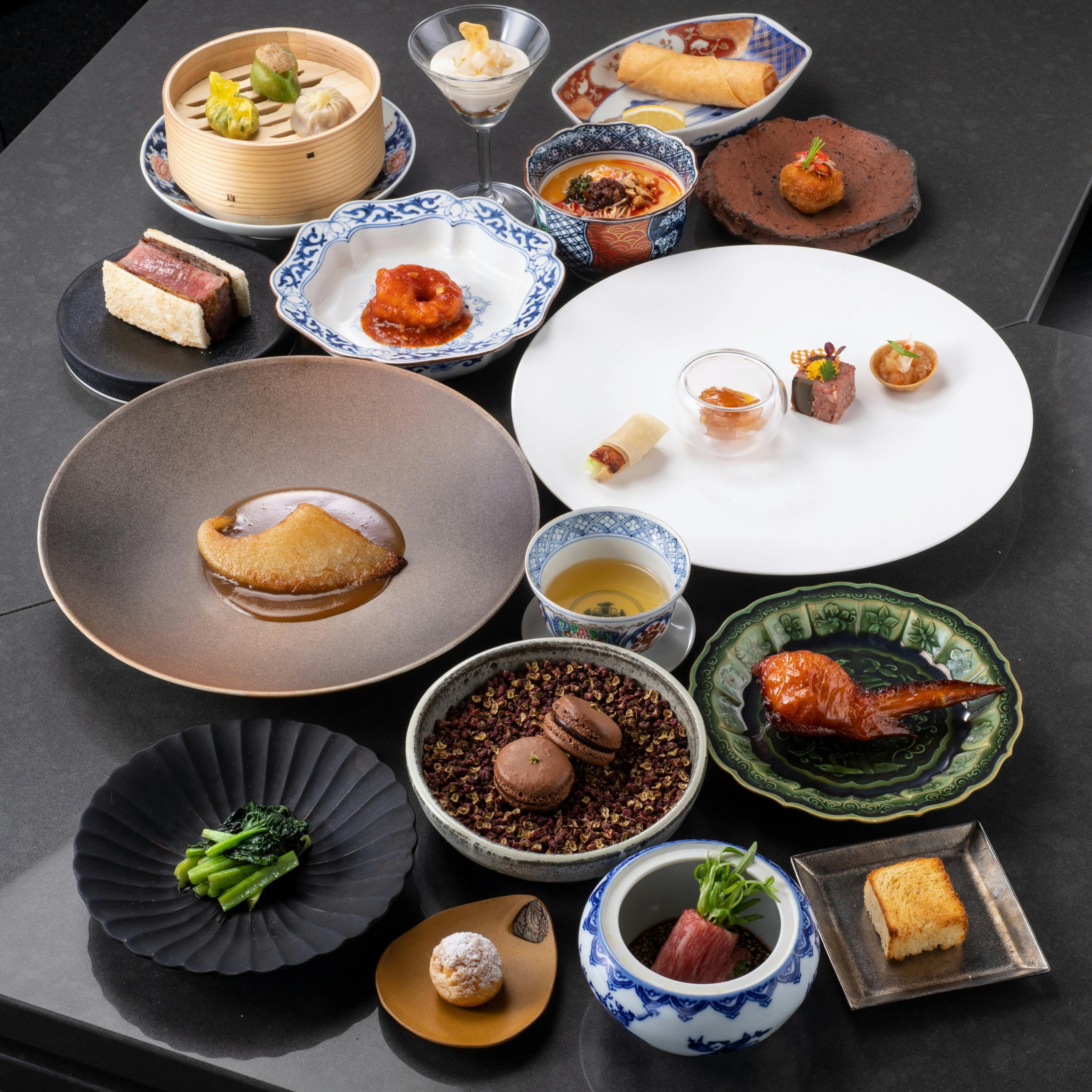 お料理はエビチリや点心、炒飯など誰もがご存知のお料理に少しひねりを加えた24品目が登場します。季節感あふれる素材や定番の酢豚等、様々なお料理を少しずつお楽しみいただけます。