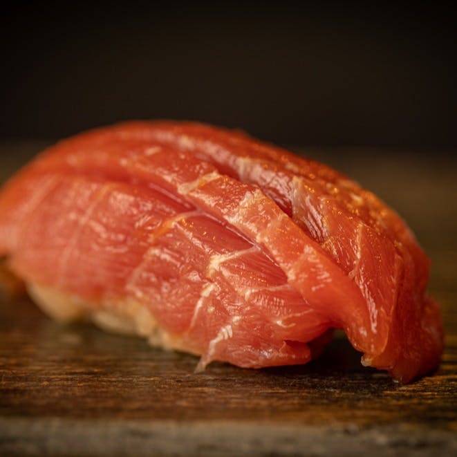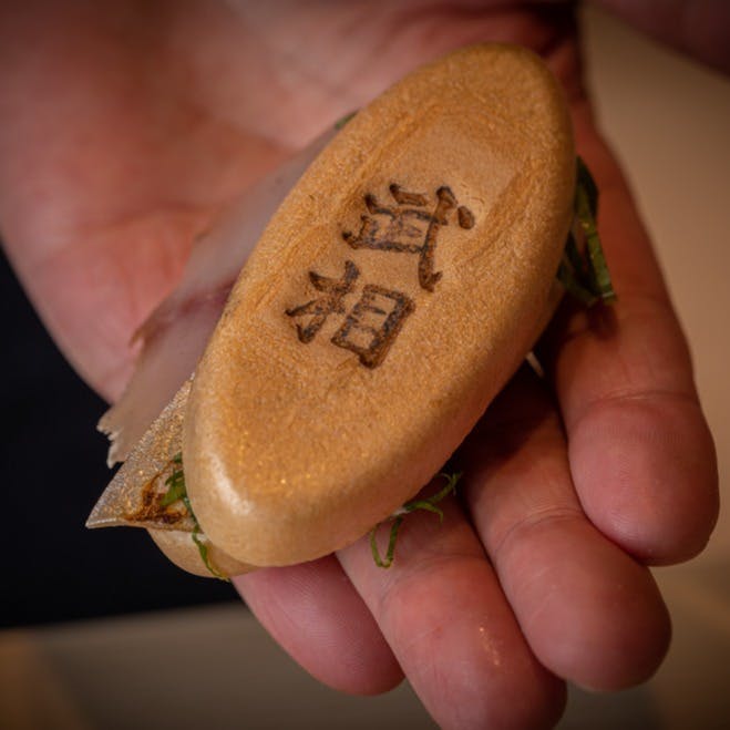 武相鮨というテーマの元、こだわり抜いた江戸前鮨をベースに自由で寛容さのある地域性と、街道沿いであり様々な文化が交錯する歴史的背景を感じ取りながら、鮨の世界を表現しています。内装デザインも武相の力強さを表現し、大切な方と温かいひとときを過ごしてもらえるような空間つくりを意識しました。武相の文化と歴史を「武相鮨」という新しいスタイルにのせて提供させていただきます。