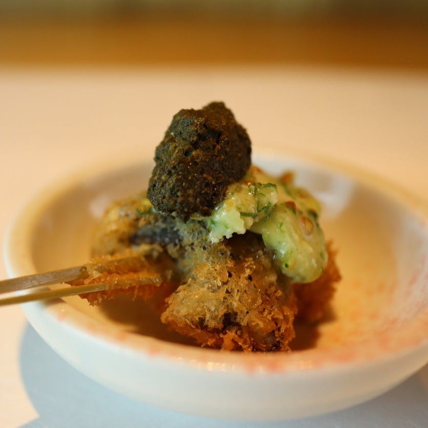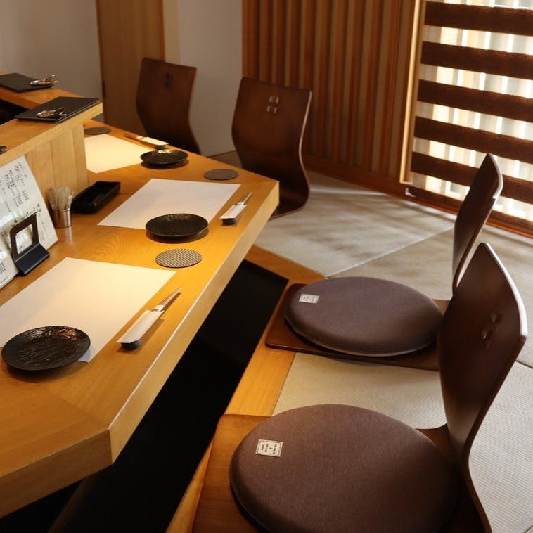 肥後橋駅より南に徒歩5分にある「靱公園」近くにお店を構えております。 店内は、調理風景を一望できるカウンター席のみのお作りとなってます。目の前で繰り広げられる職人技も併せてお楽しみください。旬の食材を存分に使い、一品ずつ味わっていただけますよう、都度彩豊かな小皿にてご提供いたします。 旬の食材×串×空間のすべてをおもてなしいたします。