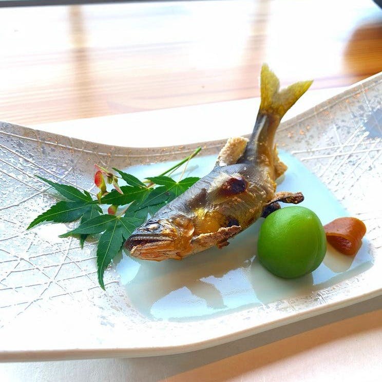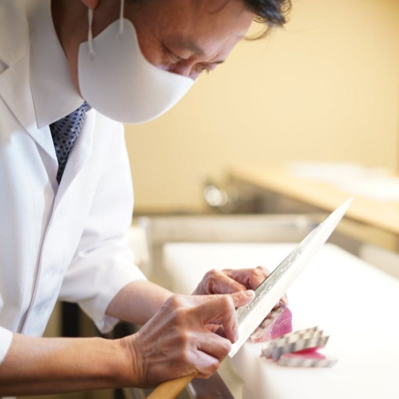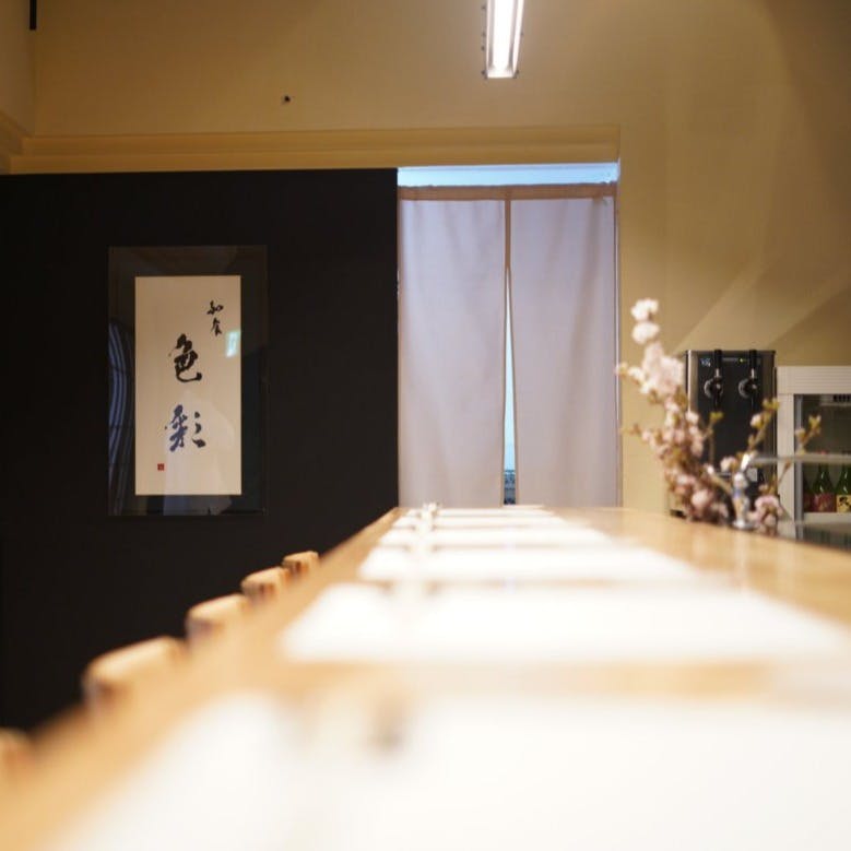 当店の「色彩」と云う名前は、四季折々の「旬」の食材をその食材の良さを活かす調理法をもちいてお客様の目の前で調理させていただき召し上がっていただくことで「味」はもちろんのこと「食感」、「色」、「鮮度」、「音」など食材が本来もちうる色とりどりの「色彩」をお客様の五感で感じていただきたい、と云う願いをこめて名付けました。また「色彩」のお料理をご提供するためには一度にお越し頂くお客様の数を絞らなくてはなりませんでした。そのため「色彩」は調理場を一望できる据え付けカウンター六席のみで営ませていただいております。「和食 色彩」をご贔屓によろしくお願い申し上げます。