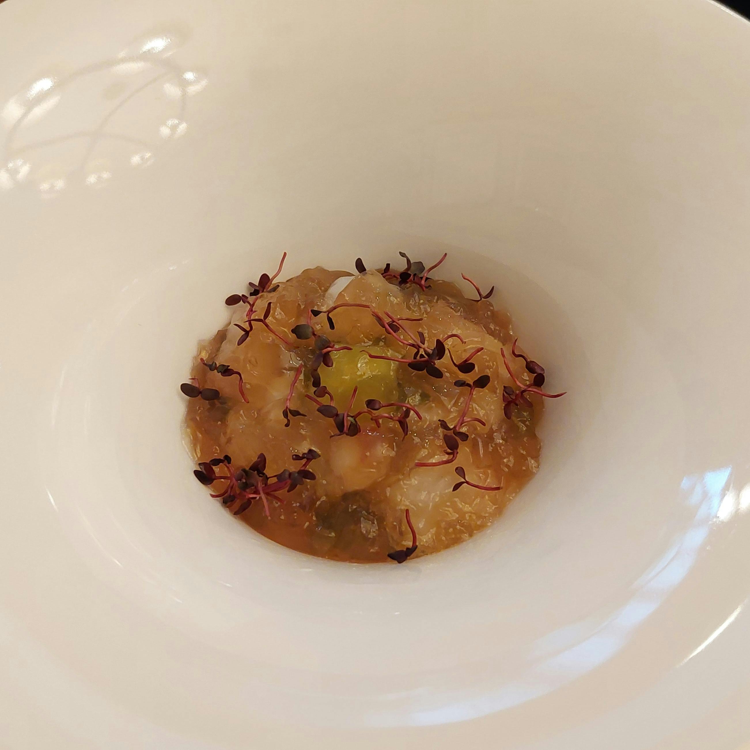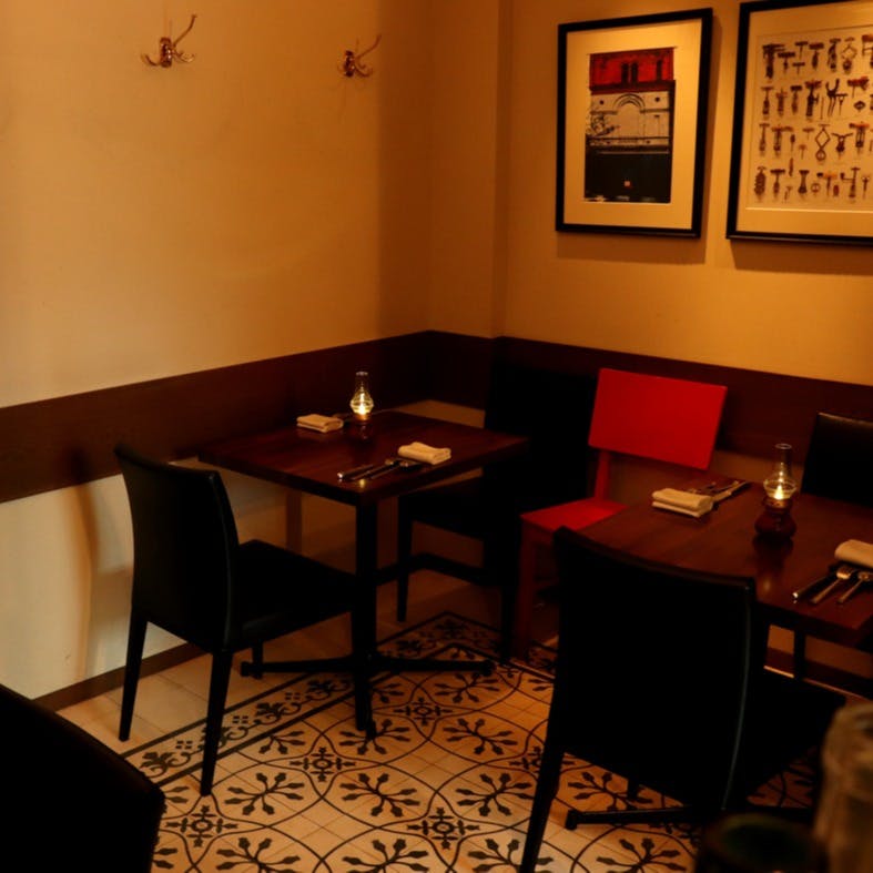 真っ赤な外観が印象的。まさにビストロといった風情。店内には10席のみの小さな居心地の良いダイニングが広がります。フランスで買い付けた絵画たち、タイル敷きの床。フランスらしい空気に囲まれて過ごす時間は、満ち足りたものになるはずです。こじんまりとした空間は、プライベートパーティーにもおすすめ。気の置けない仲間と上質なフレンチを是非お楽しみください。