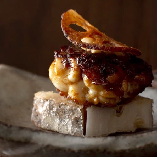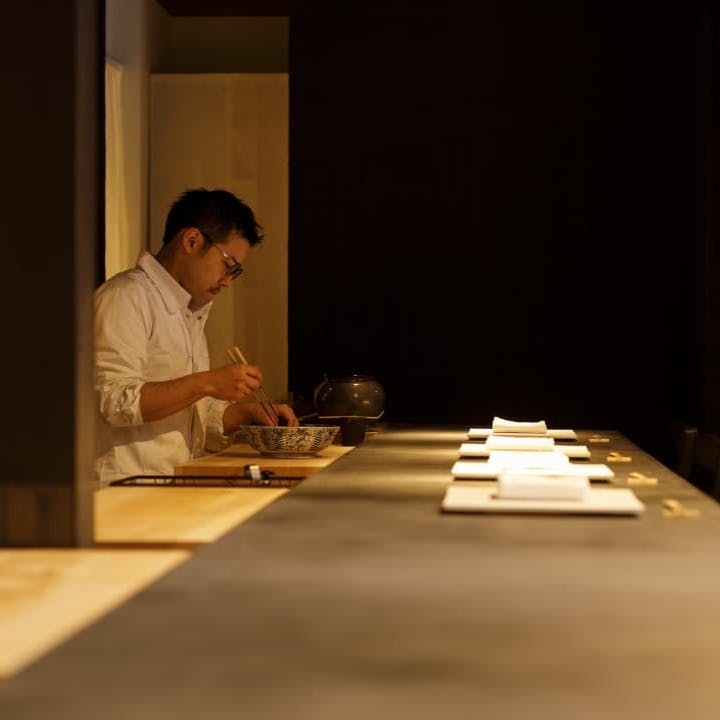 建物の脇の細い路地を通り抜け、くぐり戸から中へ。大きなL字のカウンターはまさに今井さんのステージといった趣だ。「食材のポテンシャルを引き出しながら、驚きのある料理を提供したい」と生き生きと料理に向かう姿が頼もしい。