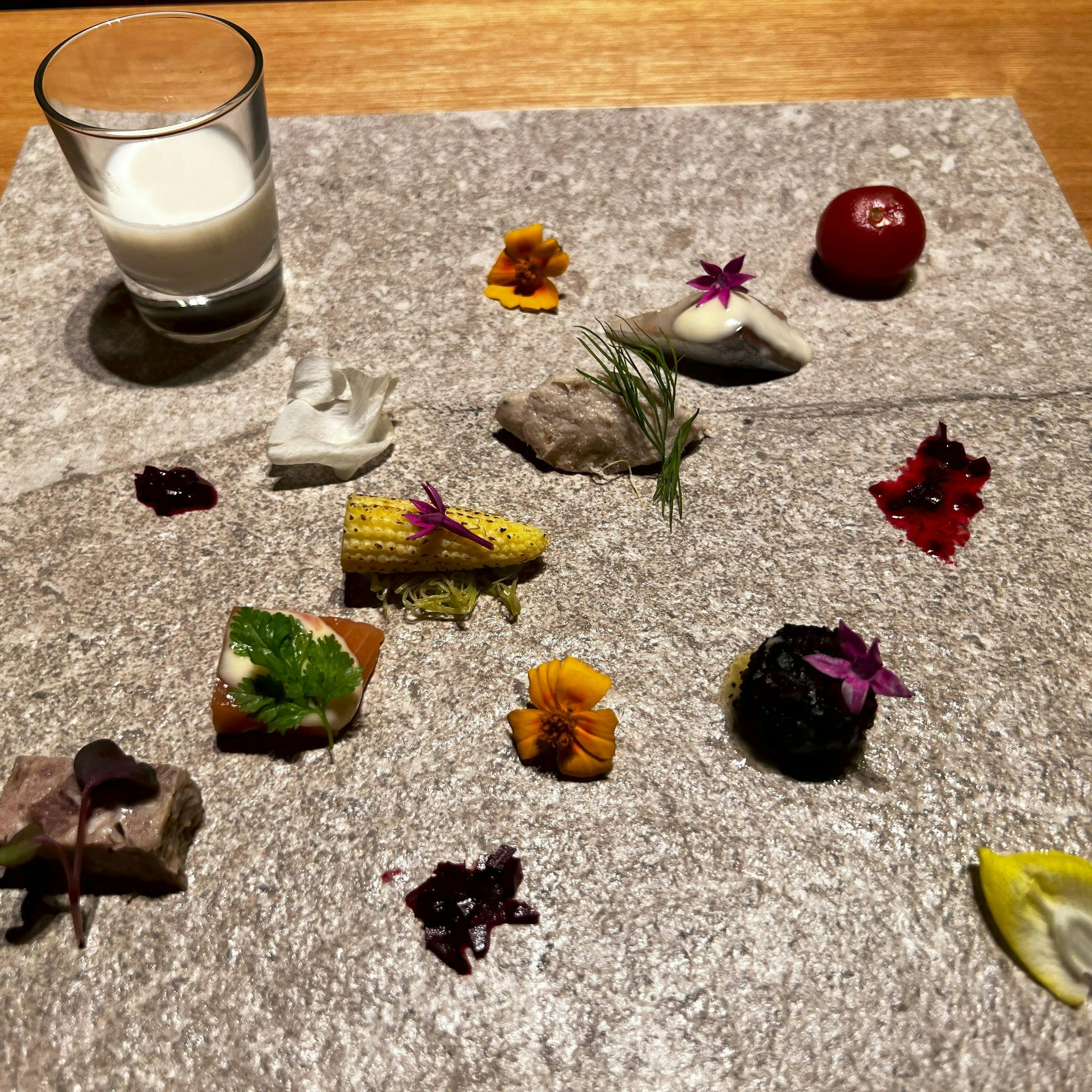彩とりどりに散りばめられた食材を一口サイズでご用意。 見た目も華やかで季節により食材も移ろいで行きます。 ビールから始まり、シャンパン、白ワインお好みに合わせてお召し上がりください。