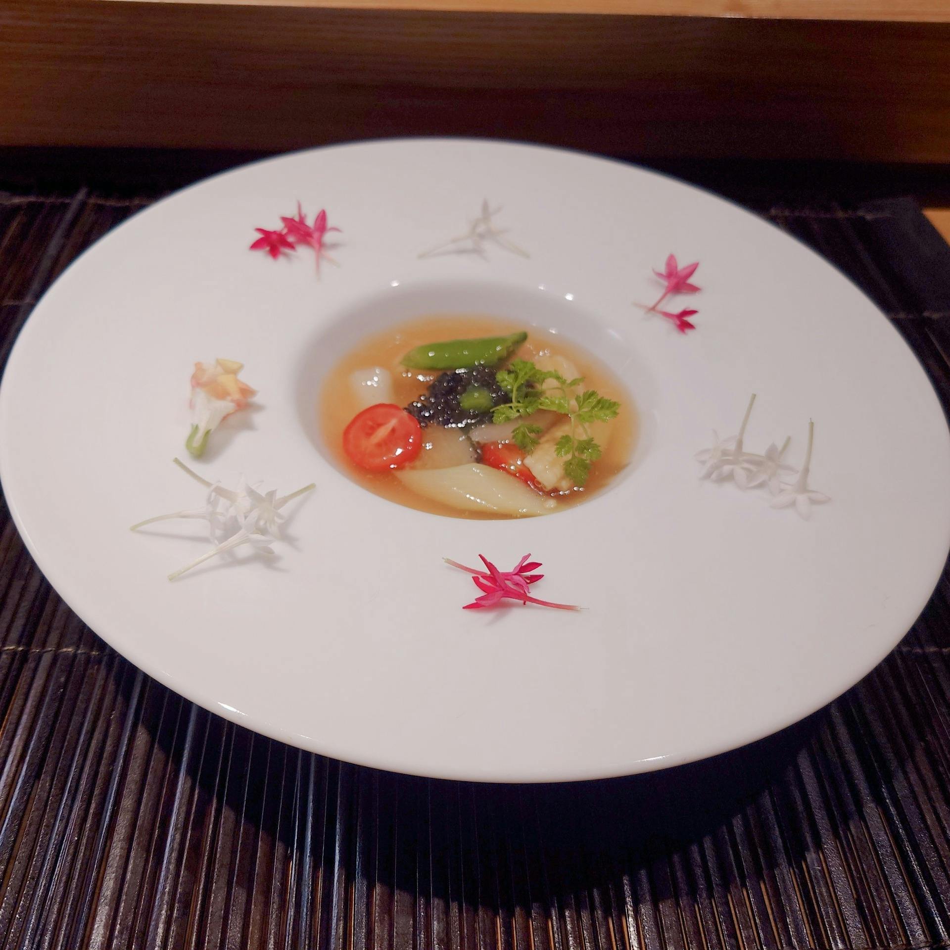 女性に人気の一品です。 野菜本来の旨味や食感もさることながら、コンソメの香り豊かな 優しい味わいのジュレにより際立ったおいしさに仕上がりました。 白ワインやシャンパンとのマリアージュで是非お楽しみください。