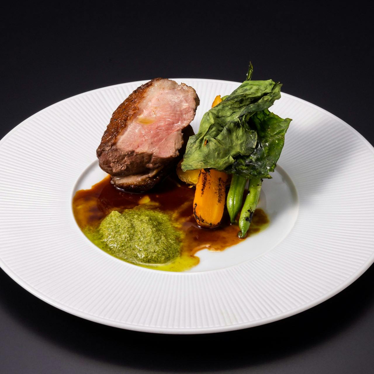 都内屈指のフレンチ名店で修行したシェフの創作『伊豆ジビエ』料理。 お料理はコース料理のみ。 ジビエ初心者~上級者の方まで、皆様大満足の多彩な5種類のコースをご用意。 気のおけない仲間や家族との楽しい会食・貸切宴会・取引先の接待など、シーンに合わせて幅広くお選びいただけます。 【隠れ家ビストロ】 都会の喧騒から一歩離れたビル2階。落ち着いた和風の内装。