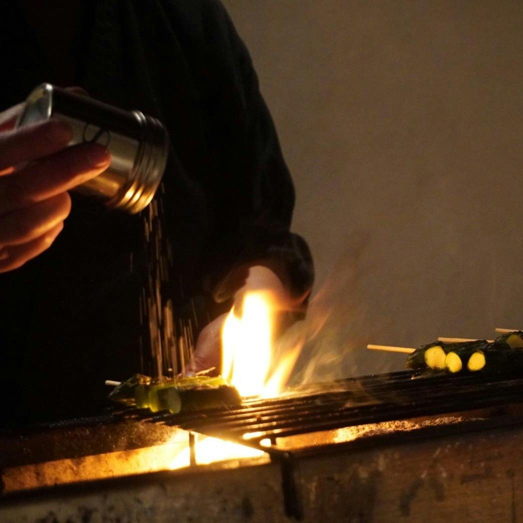 心斎 橋アメ村の裏路地にある「両忘」。お任せコース一本でのご提供します。シンプルな焼鳥を追求し様々な地鶏を薪と炭で焼き提供します。季節に合わせて変化する食材で季節の感じることができる焼鳥になっております。