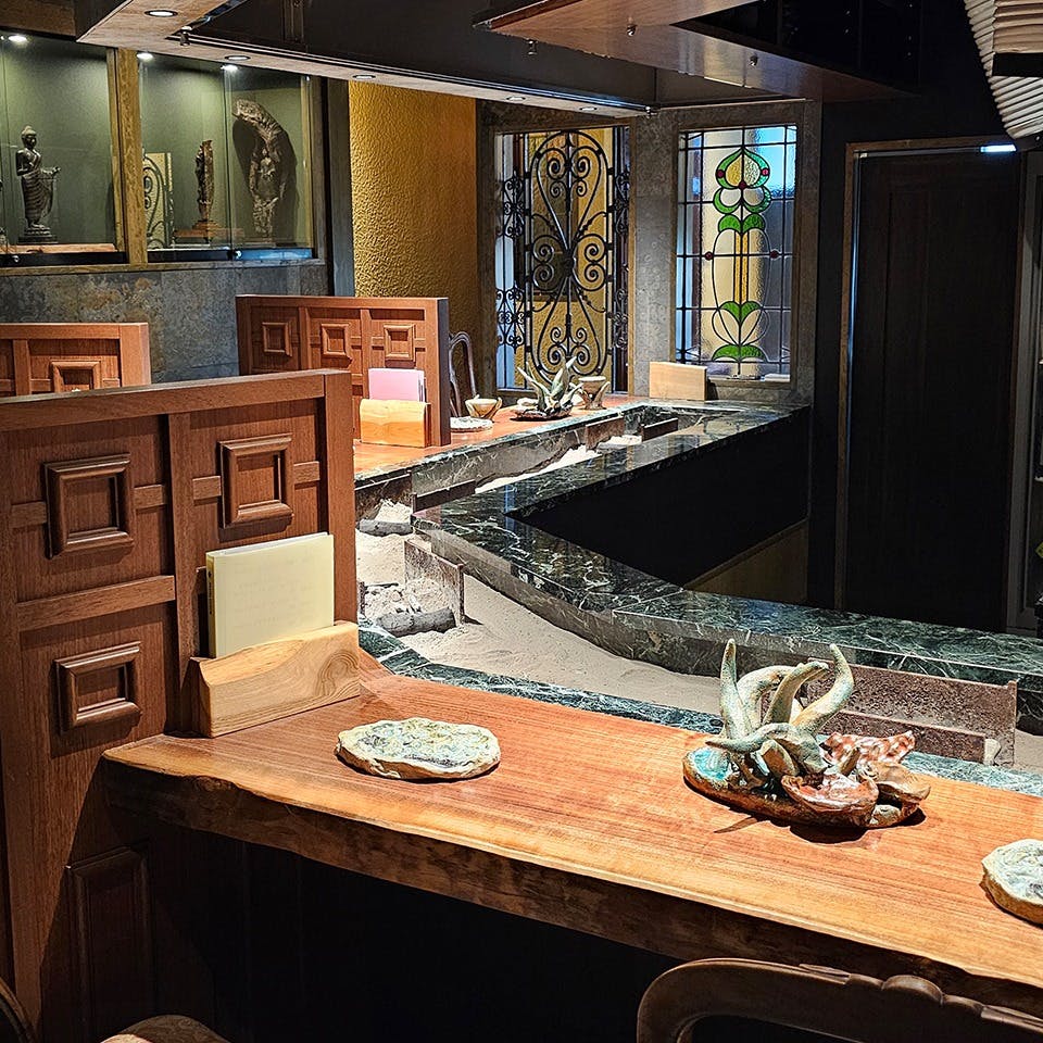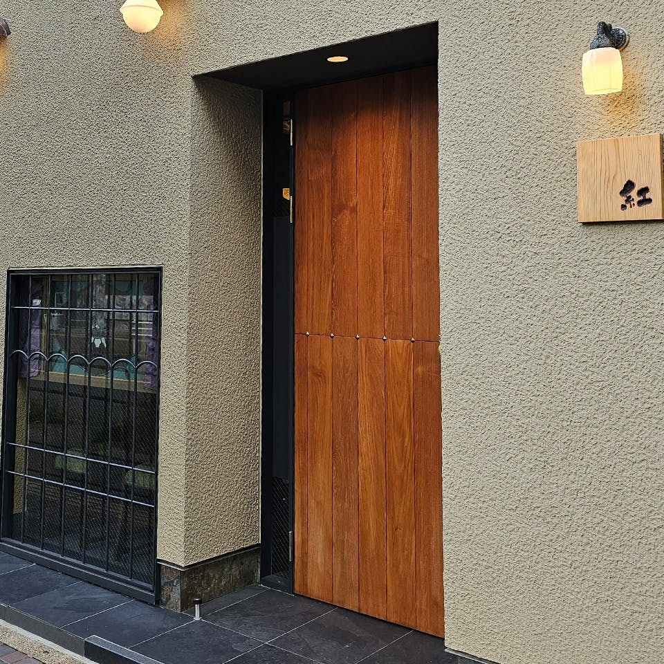 名古屋・池下駅から徒歩4分の位置に佇む『炭焼いろり料理 紅』。黒毛和牛や季節の魚などのこだわりの食材を目の前のいろりで焼いてお楽しみいただけます。2名づつで仕切られているカウンター席は、周りを気にせずにゆったりとお過ごしいただけます。いろりには原木備長炭を使用しており、じっくり焼いた食材は旨味が凝縮され香ばしく美味しいです。全国を訪れこだわり抜いた銘酒たちやヨーロッパのワイナリーより仕入れたビンテージワインなど、お飲み物も豊富にご準備しておりますのでお料理と合わせてご堪能下さい。
