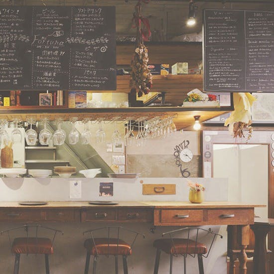 賑やかな街の一角に、ひっそりと佇む「Fortuna」。アエル裏の裏道から細い階段を上がると中には温かみのあるアットホームな空間が広がります。店内には木を中心とした席が用意され、カウンター・テーブル・キッズスペースを完備。家族やご友人同士、仕事終わりにも気軽にご利用いただけます。そしてシェフが素材に合わせ丁寧に作り出す料理は素材の味を活かした一皿に。ソムリエールのマダムがおすすめするワインとの相性が抜群です。すべてのお客様が幸せな気持ちになって家路へ着きますように。という想いを込めて。
