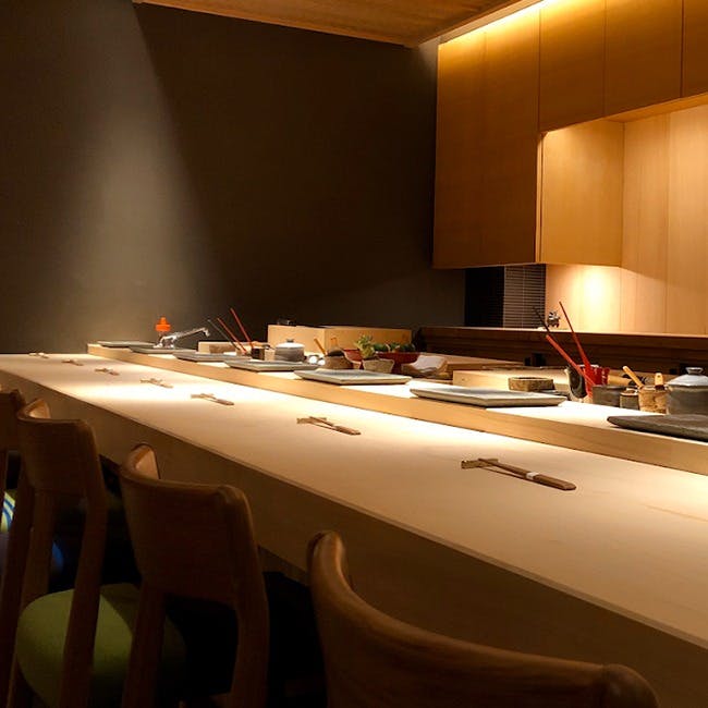 愛媛県、大街道駅から徒歩3分の場所に位置する【鮨かわなか】 大将の川中 航勇氏は、生粋の愛媛県人です。松山で生まれ、松山で修業し、松山で独立された方。 だからこそ、愛媛の魅力を十分理解されておられ、瀬戸内の魚はもちろん全国から厳選した素材を使用しており、魚にあった仕事を施し提供します。大将自ら厳選した食材で造る美しい料理と、確かな技術で握る鮨をコースで是非味わって下さい。 店内は、職人技を目の前で拝見できるカウンター席とテーブル席をご用意しており、木のぬくもりを感じる、洗練された雰囲気の店内で、記念日や接待などの大切なシーンでご満足いただけるひと時をお過ごしいただけます。